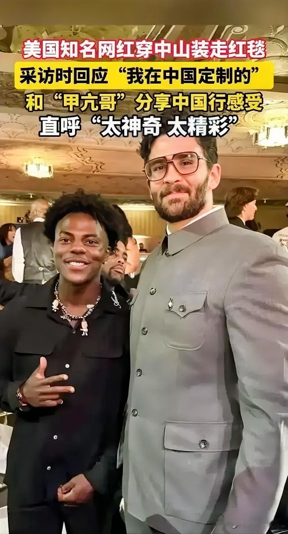 美国网红穿中山装走红毯,文化交融引热议 2025年12月7日,美国网红哈桑·阿比身着在中国定制的中山装,亮相美国“流媒体颁奖礼”红毯。他称此举是对中国文化的尊重,文化本无国界。此前他中国行体验了高铁、扫码支付等,中山装成了他理解中国的象征。这一行为引发全球关注,网友盛赞这是中国文化输出的生动案例,也让更多人看到中国文化的独特魅力。