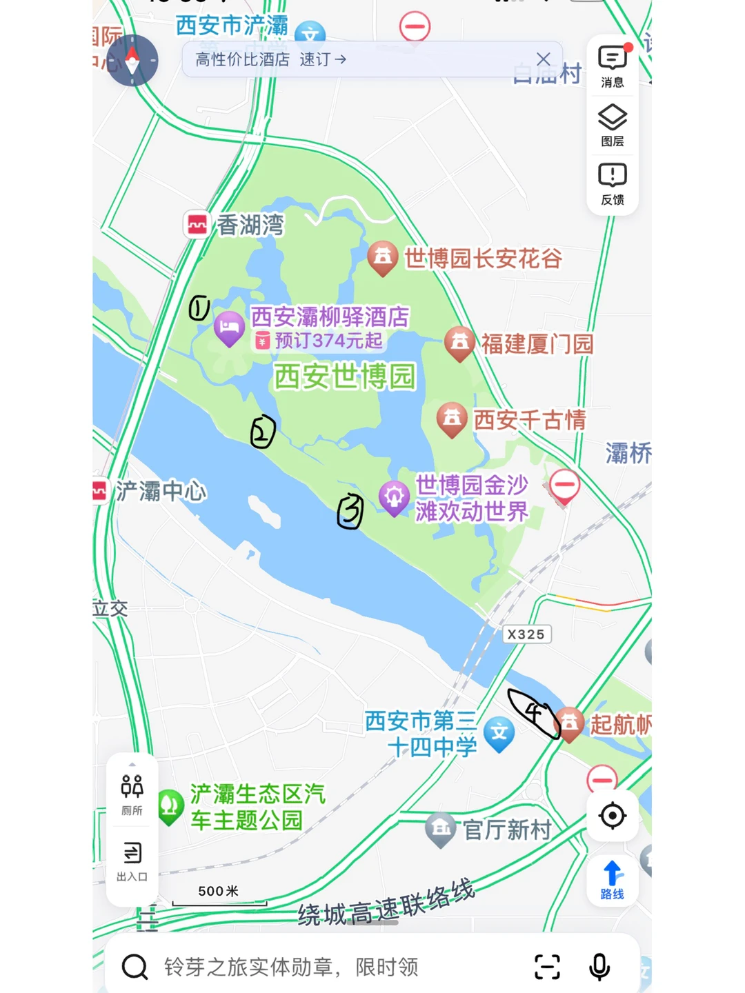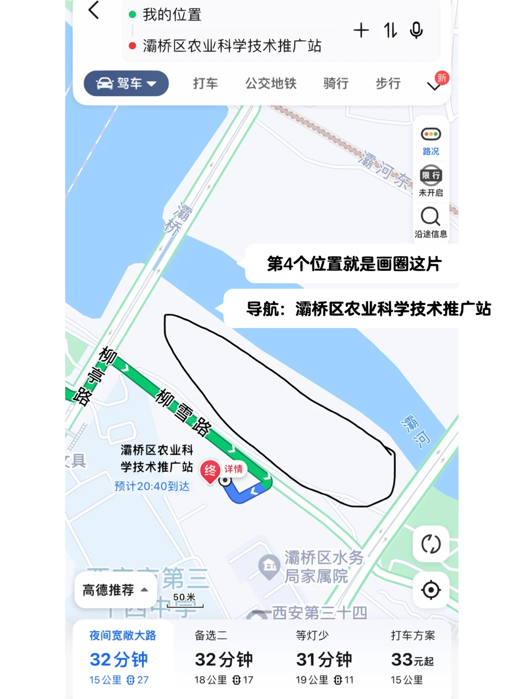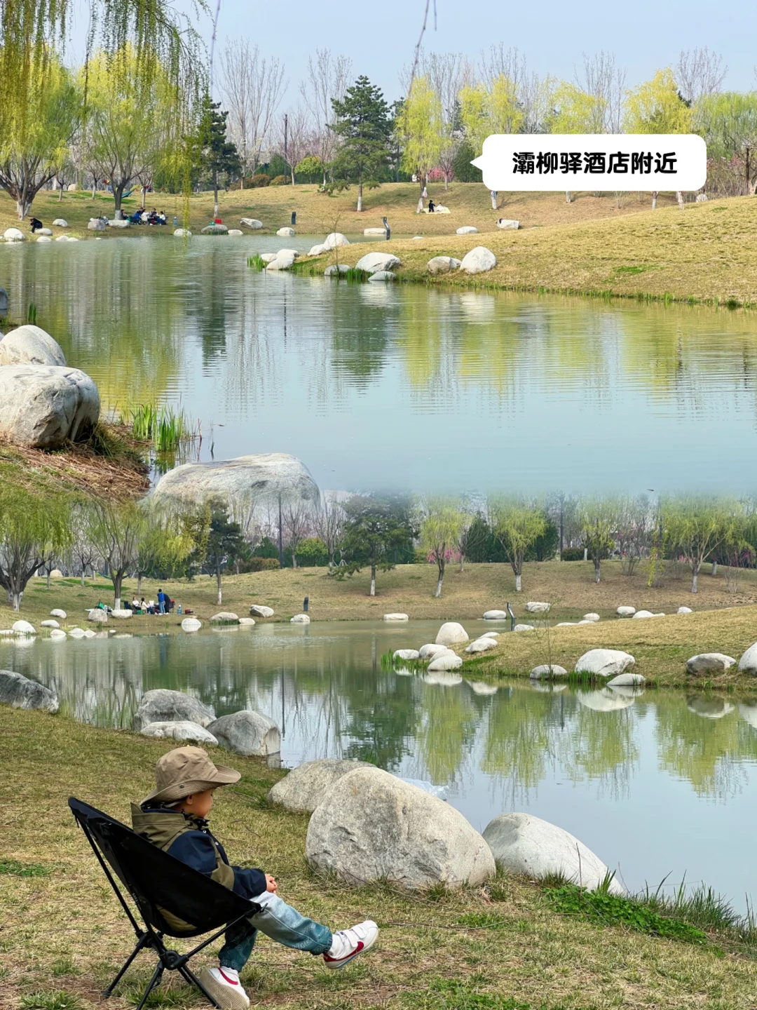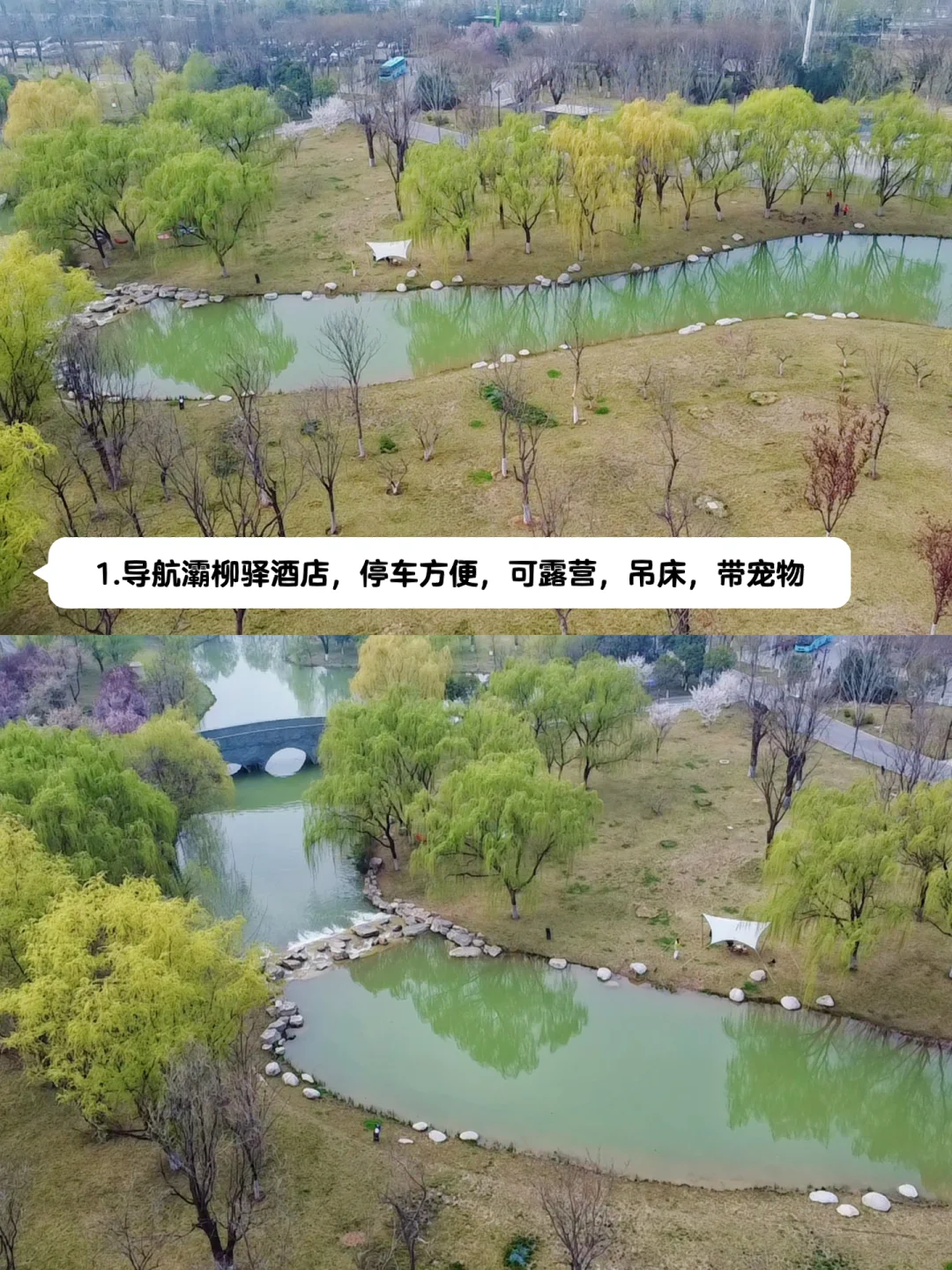 [向右R][向右R]第一个导航灞柳驿酒店,不到酒店里面,就在外面的停车场,不过那个桥,就在桥两边,环绕小河的地方都可以露营,附近有厕所,停车到河边100米,无坡。