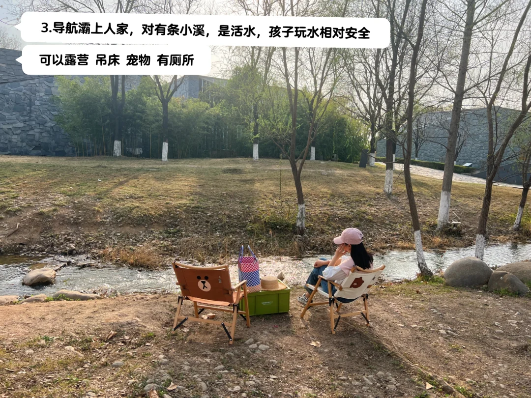 [向右R][向右R]第三个导航灞上人家,车停路边,走下去100米有条小溪。树荫很多,夏天带孩子玩水挺美。厕所2分钟路程。