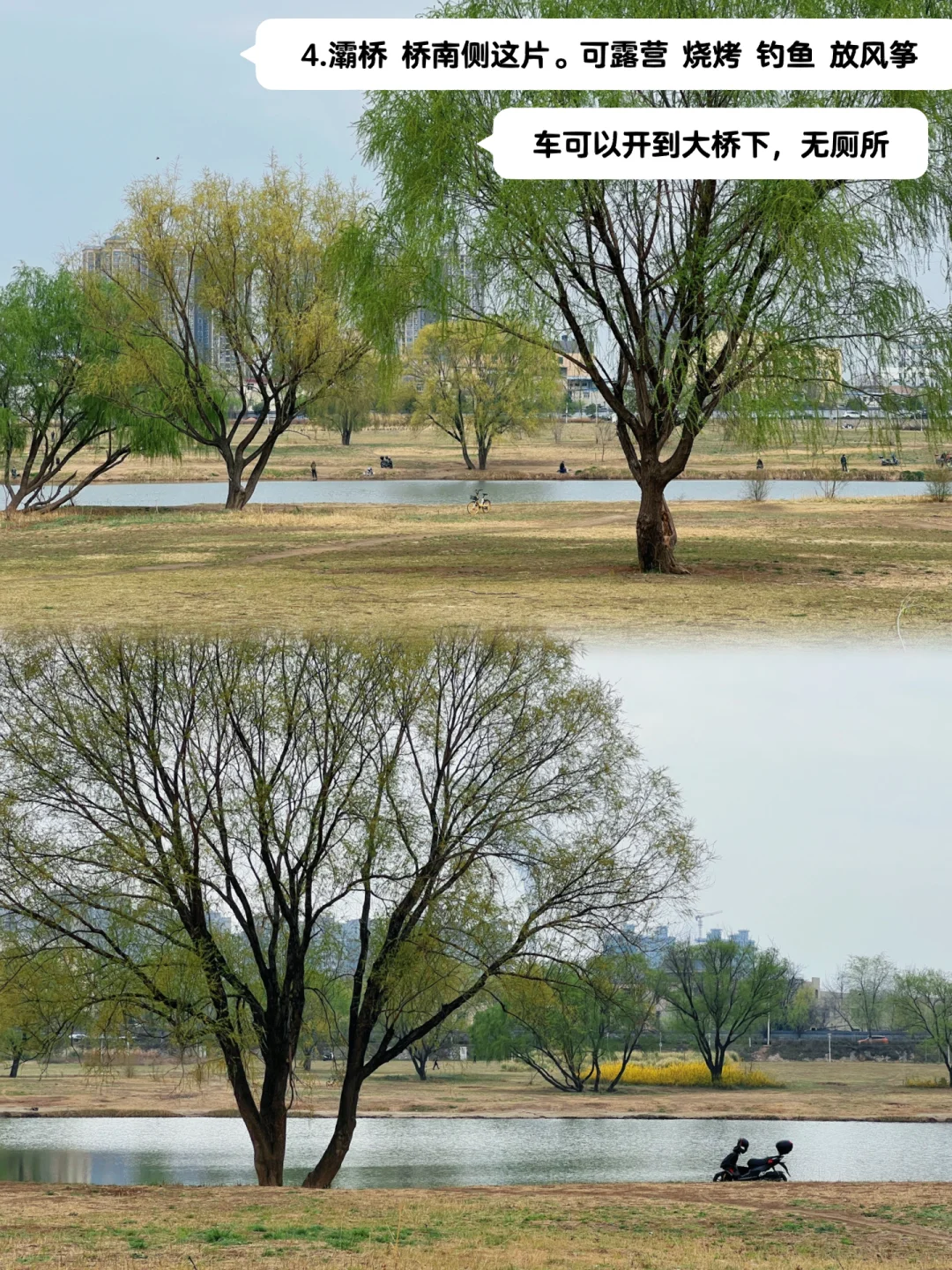 [向右R][向右R]第四个是灞桥 桥南一片,场地很大,可以钓鱼,烧烤,放风筝。摩托可以骑到,附近有厕所,在桥下卖风筝往前走50米,此处每次路过都有车开下去了,但下去的口我没找见。有知道的朋友可以告知一下。