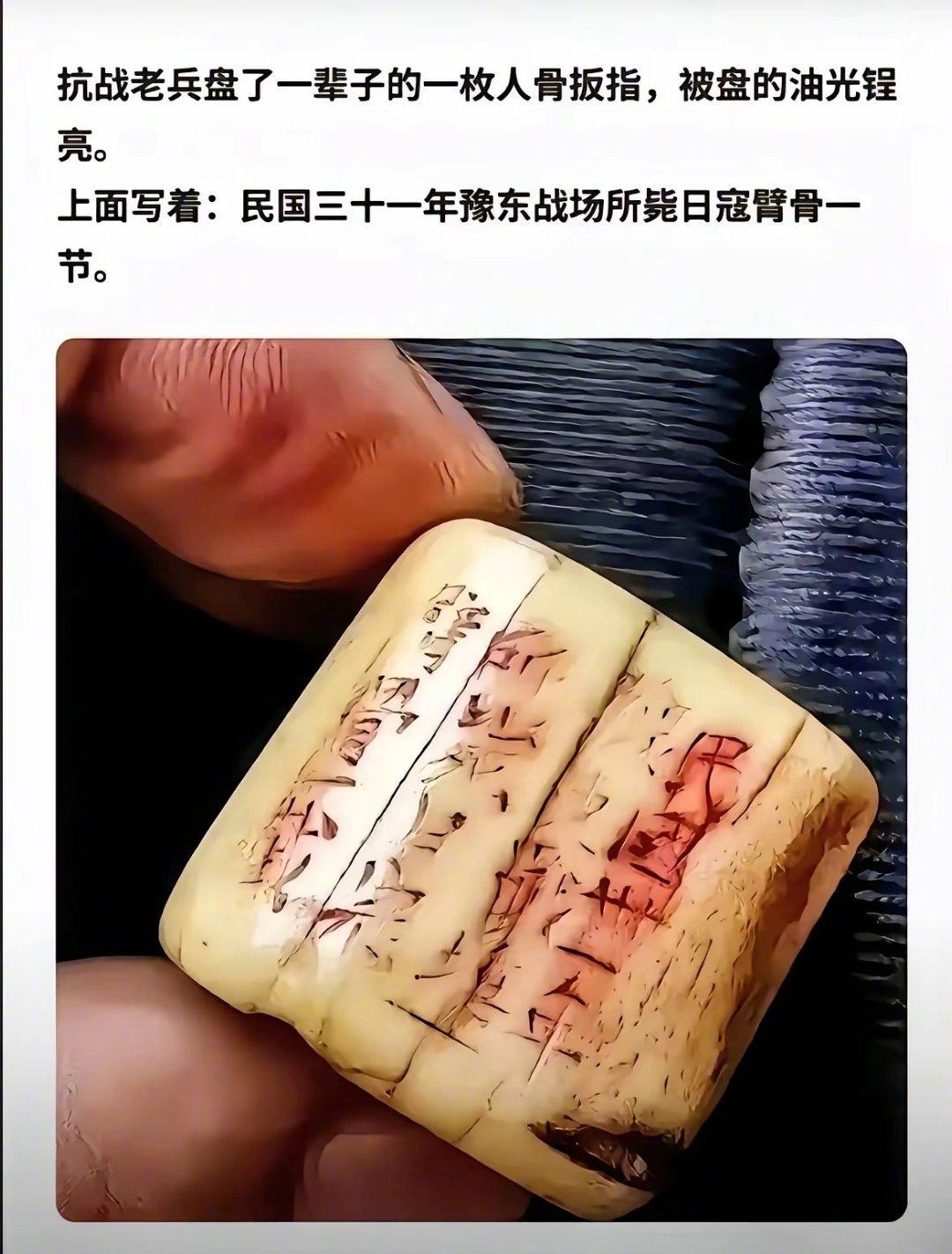 抗战老兵盘了一辈子的一枚人骨扳指,上面写着:民国三十一年豫东战场所毙日寇臂骨一节。