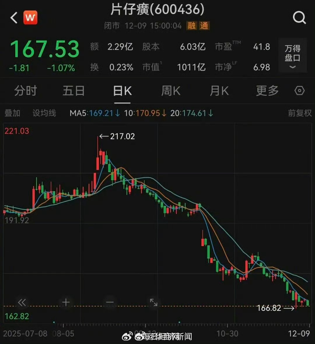 【#片仔癀股价跌去60%林园仍一股不卖#,“这是好东西找不到”!一粒一度被炒到1600元,如今降到几百元】#曾被炒到1600元的片仔癀降到几百元# 12月9日,知名投资人林园现身片仔癀2025年第一次临时股东大会,当被问及是否还坚持片仔癀股票一股不卖?林园回应称:“我卖它干什么?”他还表示:“我觉得(片仔癀)这是好东西,找不到。”公开资料显示,林园从2005年便开始介入持有片仔癀。他还公开表示,“片仔癀是独门生意,他们最终要卖到至2瓶茅台的价格”。10月28日,据上海证券报报道,林园称自己是片仔癀的消费者,他母亲也是。像这样的标的,全球市场也是不多的。值得注意的是,片仔癀公布的最新三季报数据难看,2025年前三季度,片仔癀营收为74.42亿元,同比下滑11.93%;归母净利润为21.29亿元,同比下滑20.74%。同时,今年第三季度存货增至61.6亿元,相较今年初增长了24.02%。这是近10年来,片仔癀前三季度的营收和净利润首次负增长。业绩的压力直接反映在股价上。2021年片仔癀市值曾一度突破2900亿元,而截至2025年12月9日收盘,其股价为167.53元/股,已较2021年12月的高点累计跌去超60%,最新总市值1011亿元,已较高点蒸发1889亿元。曾1600元一粒难求的片仔癀锭剂,如今价格跌至几百元。12月9日,每经小编查询各电商平台看到,片仔癀锭剂(3g*1粒/盒)在淘宝官方平台片仔癀大药房旗舰店售价为760元,而部分药房零售价在645元至760元不等,相较于官方零售价最高降价超15%。此外,美团自营大药房售价为639元,京东京喜自营官方店售价为614元。(每经综合,德塔)股价4年跌去60%,仍一股不卖!投资大佬力挺片仔癀:“这是好东西找不到”!一粒一度被炒到1600元,如今降到几百元
