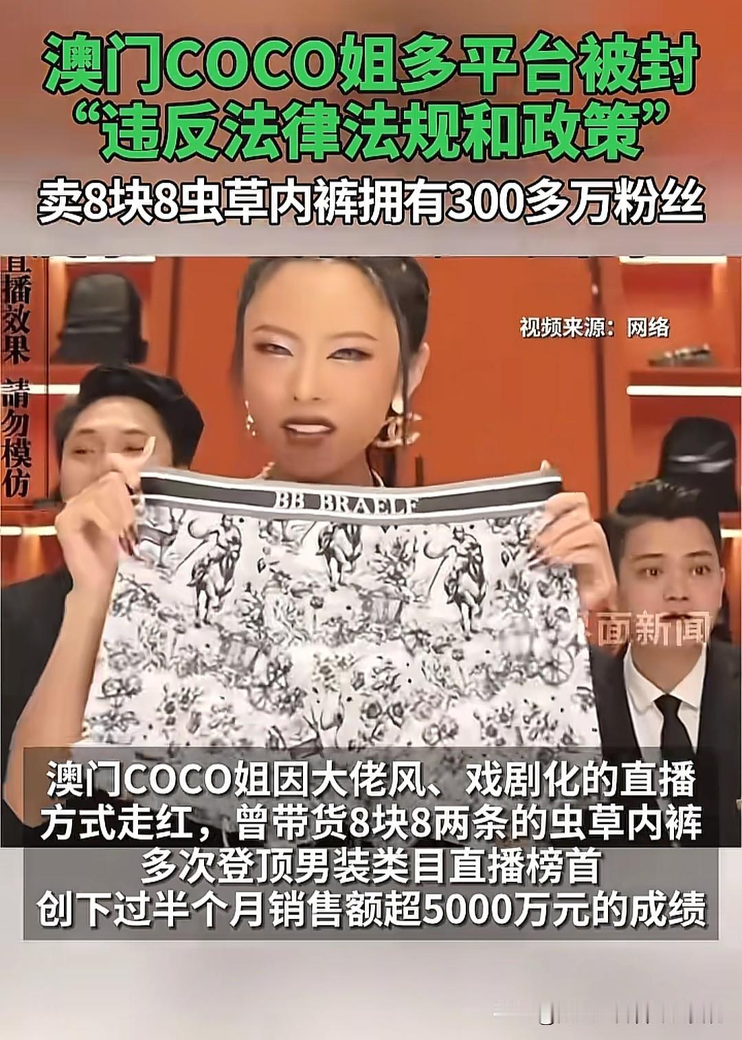 澳门COCO姐原本是服装设计师,合作过众多明星且获过设计奖项,以前可不是大家现在看到的那样狂野,而是一副温柔知性、安静裁剪衣服的模样,直播风格跟很多主播一样,都是按着常规思路介绍服装,一开始数据还不错,但总会有上限。 后来澳门COCO姐开始打造奢华场景,采用爱马仕配色装潢、外国模特助播,用礼盒包装低价商品,营造“奢侈品般的氛围,十元店的价格”的强烈反差感,再结合夸张话术和戏剧化表演把情绪价值拉满,吸引观众下单,成为了“大佬式”直播风格。 澳门COCO姐是成功的,但她忽略了一点,无论场景、人设如何的高大上,本质都是忽悠,几块钱的东西本来就没人要,一顿忽悠之后,很多人抢着购买,让很多没有需求的人变成韭菜,这是很多电商平台所不提倡的,只要有剧本,虚假宣传,都是要整改的。