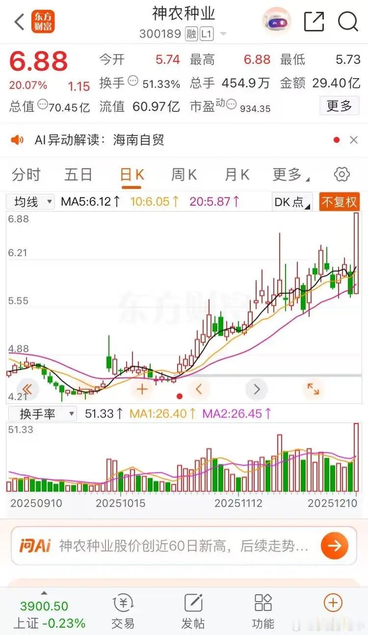 摩尔线程真强,浔兴股份反包,神农种业海南自贸摩尔线程涨幅16.98%,收盘报收735.00元每股,最高797.97元每股,最低617.01元每股,成交金额108.2亿元,中签者今日卖能挣35万人民币。阶段性高点了,恭喜今日卖出的。神农种业涨停收盘报收6.88元每股,成交金额29.40亿元,福建股休息,海南股上阵。浔兴股份涨幅1.84%,收盘报收11.05元每股,成交金额5.73亿元,明天反包指数66.66%,涨停价12.16元每股。