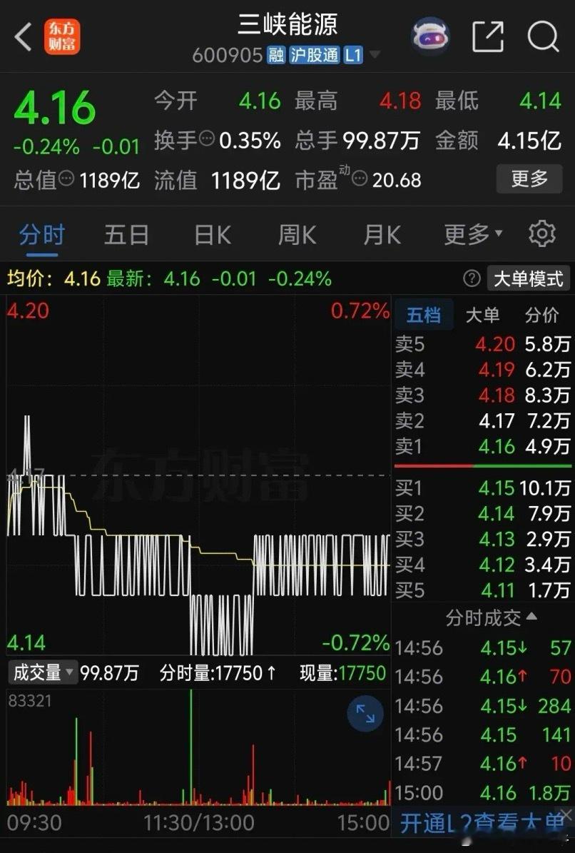 三峡能源终于支撑不住了,盘中跌破六月份低点4.15,本来前几天有企稳苗头但是最近整个股市资金都去追涨题材股特别是科技股,导致蓝筹股跌跌不休,特别是房地产股票持续暴跌使股市分化进一步加剧,不过从今天走势看并不悲观,上午震荡后下跌,午盘破位但是并没有引起恐慌,同时午后房地产暴涨,很多中字头蓝筹股触底反弹转涨,这些股票很可能见底,三峡能源这一波很可能就会企稳。