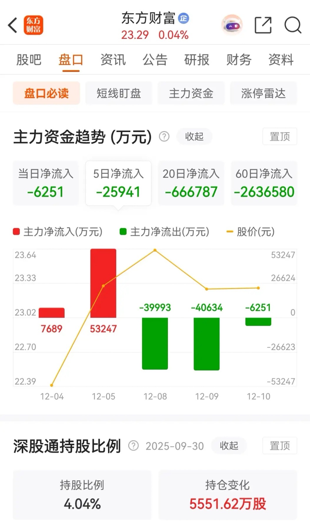 东方财富和中信证券,前者今天收时上涨了一分钱,涨幅为+0.04%,而后者则是跌了