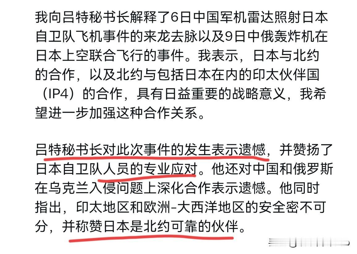 日本真是尴尬!日本防卫大臣小泉进次郎向北约秘书长告状,但是北约秘书长闭口不谈及中国!12月10日,日本防卫大臣小泉进次郎与北约秘书长吕特举行线上会议。虽然日本自己站不住理,小泉进次郎更是被质疑公开说谎,但小泉进次郎还是硬着头皮向北约秘书长吕特通报相关情况,以寻求北约的支持。 结果北约秘书长吕特表示,对这些事件的发生表示遗憾,并对日本自卫队人员的专业应对表示敬意。而吕特顾左右而言他称,对中国和俄罗斯在乌克兰问题上深化合作表示遗憾。同时赞扬日本是值得信赖的伙伴,并表示印太地区和欧洲-大西洋地区的安全密不可分。 很显然,在这个敏感的时间点,日本向北约秘书长通报相关情况,日本肯定是寻求北约秘书长支持的。结果呢?结果是平时与日本眉来眼去的北约,对于中日军事摩擦只是表示遗憾,吕特甚至就此事都没有点我们的名,反而是提及了俄乌问题。这说明什么呢?这说明对于中日摩擦,北约并不想趟这一趟浑水,不想给日本做背书。 某种程度来说,北约秘书长怕是得到了美国的授意,因此对于中日摩擦表现的态度是非常的平淡,北约反而更为重视俄乌问题。当然,我们也看出来了,北约的触手想要往亚洲伸,显然也对中俄的合作存有敌意。但仅就具体事件而言,北约给日本的支持明显不够。一句话,日本是理亏在先,中美关系处于缓和期,日本现在处境非常的孤立。
