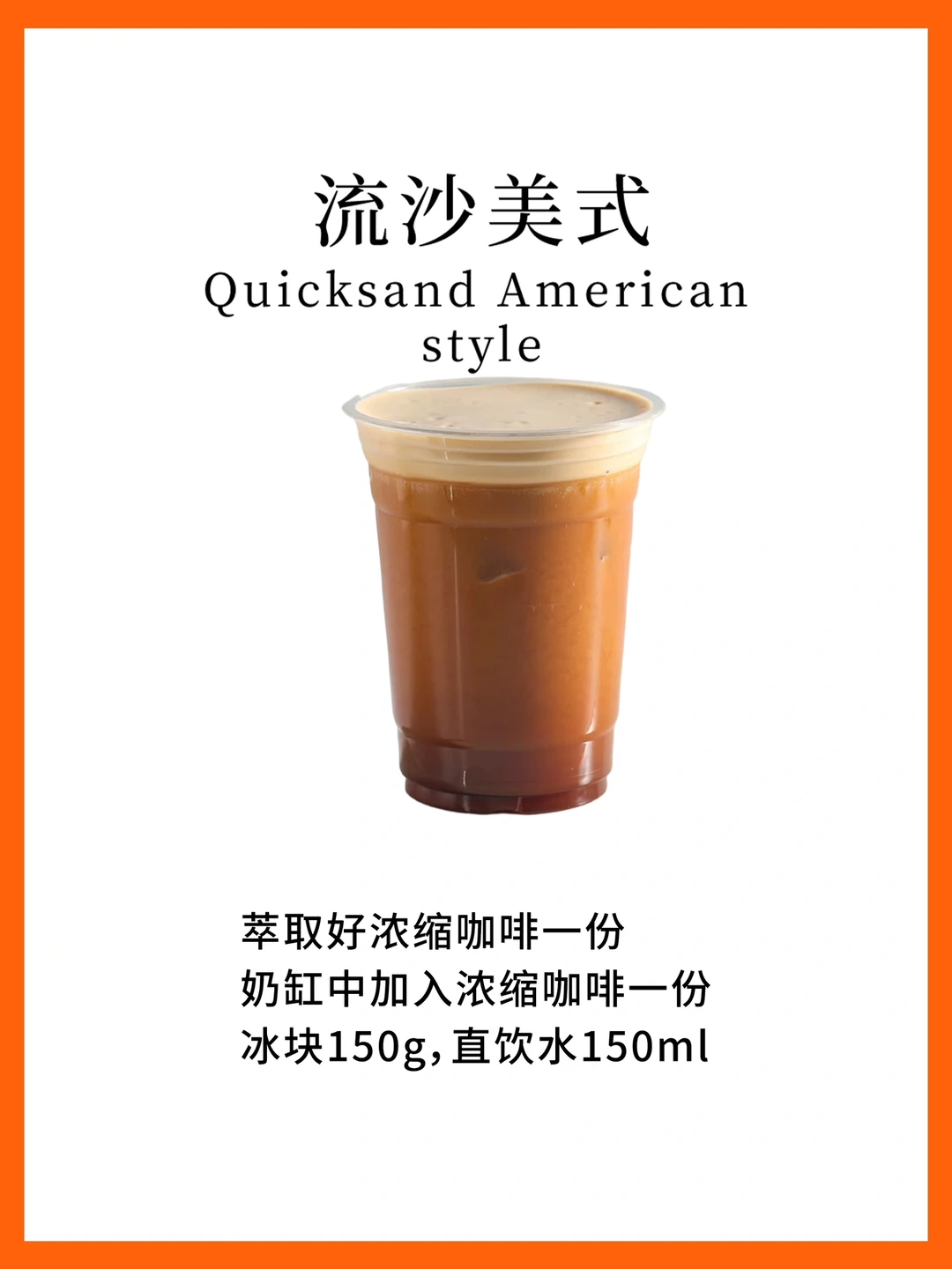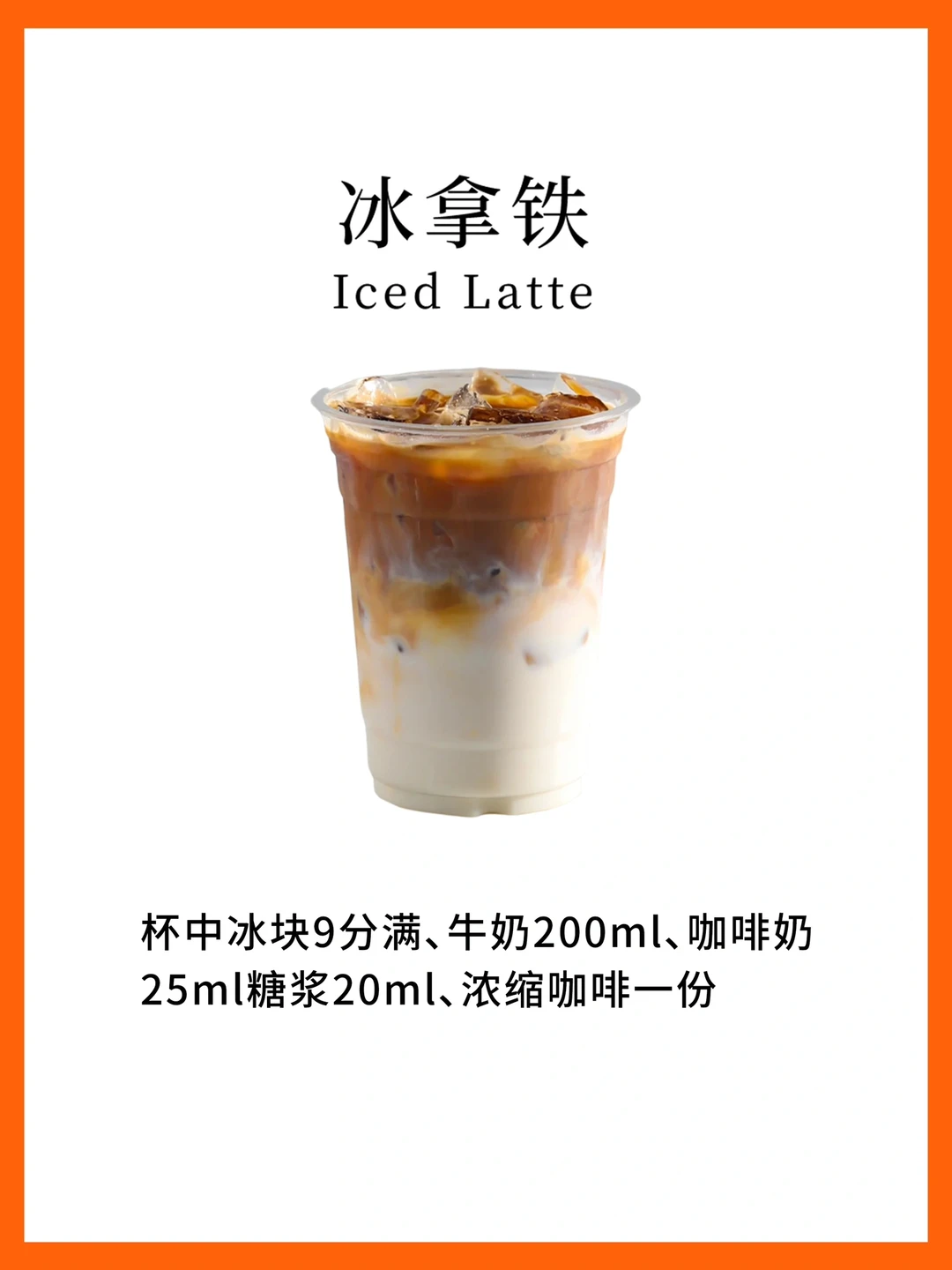 杯中冰块9分满、牛奶200ml、咖啡奶25ml糖浆20ml浓缩咖啡一份