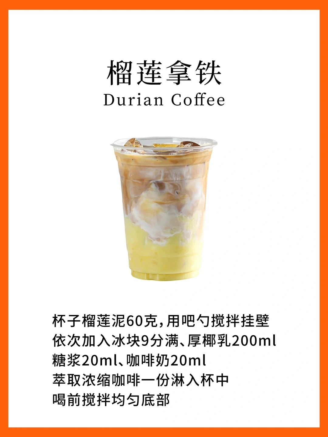 杯子榴莲泥60克,用吧勺搅拌挂壁依次加入冰块9分满、厚椰乳200ml糖浆20ml咖啡奶20ml萃取浓缩咖啡一份淋入杯中喝前搅拌均匀底部