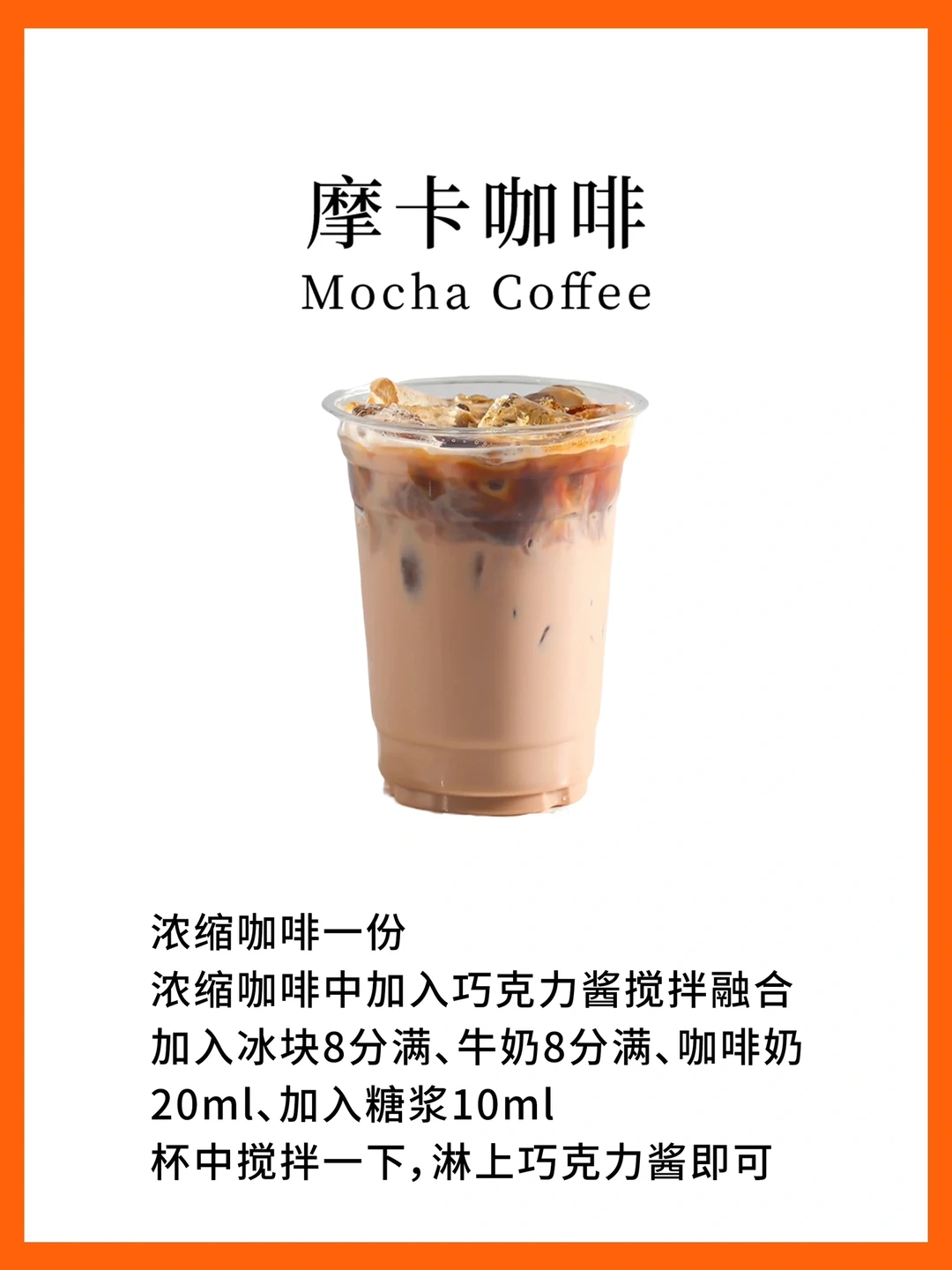 浓缩咖啡一份、浓缩咖啡中加入巧克力酱搅拌融合加入冰块8分满、牛奶8分满、咖啡奶20ml加入糖浆10ml