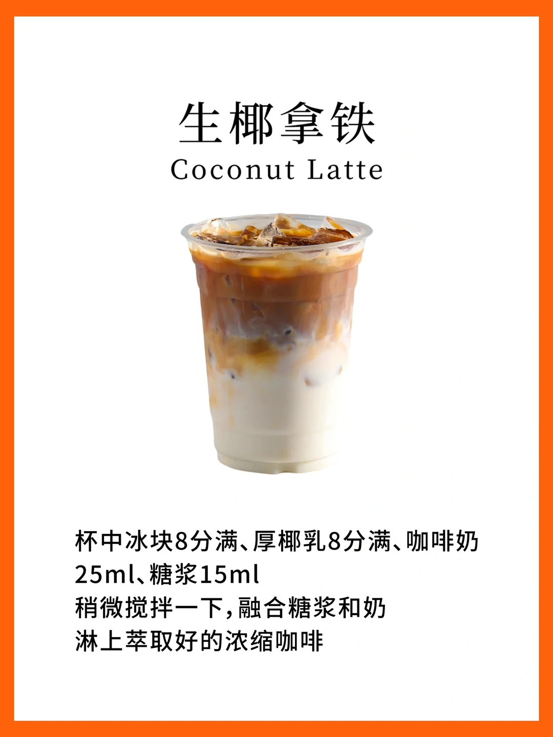 杯中冰块8分满、厚椰乳8分满、咖啡奶25ml、糖浆15ml