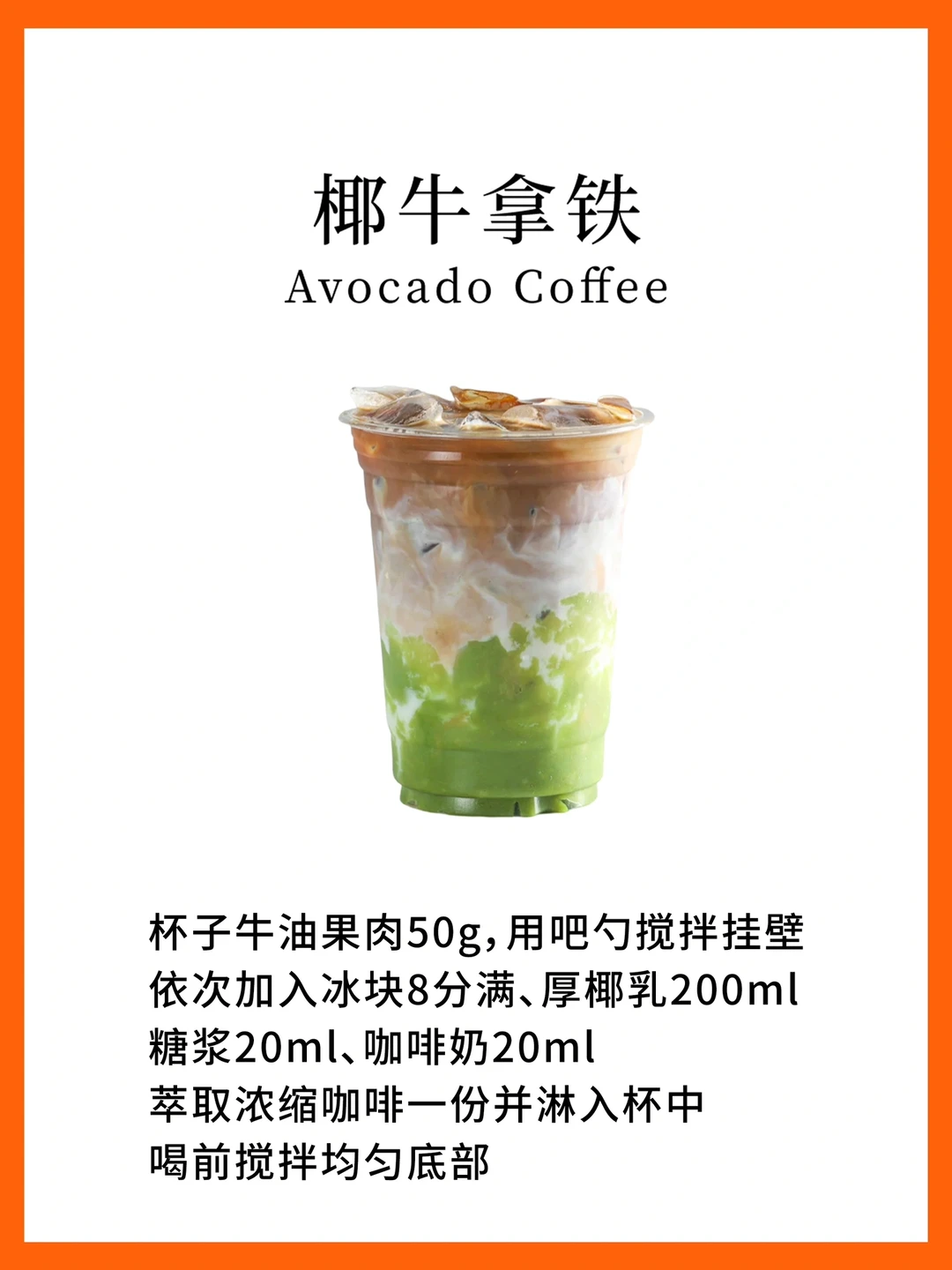 杯子牛油果肉50g,用吧勺搅拌挂壁依次加入冰块8分满、厚椰乳200ml糖浆20ml咖啡奶20ml萃取浓缩咖啡一份并淋入杯中喝前搅拌均匀底部