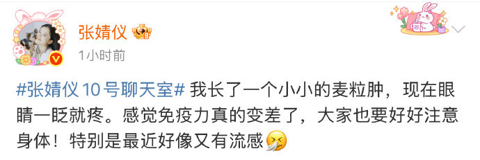 张婧仪长了麦粒肿 张婧仪与粉丝有爱互动,透露自己长了麦粒肿,细心嘱咐粉丝保重身体~粉丝集体变身“健康监督员”,麦粒肿退退退!