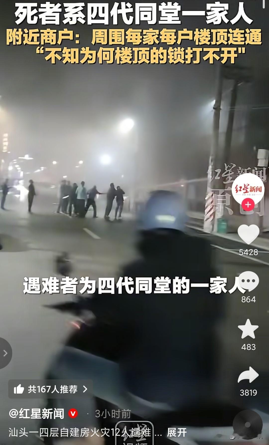 四代同堂的一家,一夜之间12个亲人永远的离开了这个世界,只有大伯一家幸存。 这家是20人,有8人当场遇难,4人烧伤最后也抢救无效,有6个孩子和大伯母逃出来了,大伯在外地,意思是大儿子一家有幸逃脱,其他人都没了。 他们本是4代同堂的一家,住在自建房里,一楼是经营了十余年的“裕丰五金电器店”,二楼堆放货物,三、四楼住人,可以从视频中看到火是从一楼蔓延上去,楼梯没有易燃物,怎么会烧到三、四楼,因为是自建房,他们就没有做消防措施,目前着火的缘由还没有查到。 所有窗户均安装防盗窗,虽部分预留逃生口,但夜间起火时浓烟封堵通道,人员熟睡反应迟缓,加上五金店存储的电气配件、铜线等物品,进一步加速了火势蔓延和有毒烟气产生,据附近商户透露,顶楼都是相通的,想去救人,但是门被锁了。 目前警方已经排除了刑事案件和人为作案的可能,发生了这样的事,广东要彻查消防,家家户户更应该重视每一个安全隐患,预留好逃生口,杂物不要乱堆,易燃物易爆的物体放到合适的地方保存。