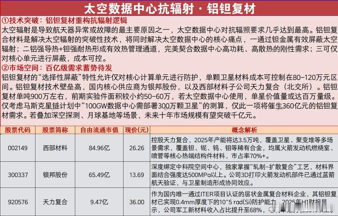 又爆了。之前媒体报道 SpaceX估值8000亿美元,马斯克回应说不准确,搞了半天是嫌媒体报道估值太低了。在SpaceX的IPO募资计划中,有一项用途被特意提及:开发天基数据中心,包括购买运行所需的芯片。说白了,就是太空算力!太空算力老核心:①顺灏股份:太空数据中心运营商,以1.1亿元战略投资北京轨道辰光科技(持股19.3%),主导"千兆瓦级太空数据中心"建设,"辰光一号"试验星算力达25P,预计2025年底发射。②四川金顶:太空算力芯片进度A股第一,子公司开物星空自研"开物神算"系列超算芯片,采用5nm先进制程,峰值算力达12.8PetaFLOPS,已应用于"天算地算"等国家重点项目。③乾照光电:航天级砷化镓太阳能电池转换效率达28%,批量供应组网卫星能源系统电池板进度A股第一,为太空算力提供持续能量支持。太空算力新细分:抗辐射·铝钽复材①西部材料:控股天力复合,2025年产能将达3.5万吨,覆盖卫星、聚变堆等多场景需求,覆盖钽、铌、钨、钼等稀有合金,均属火箭发动机燃烧室、喷管等核心热端结构件材料,市占率70%+。②银邦股份:20cm,深度绑定中科院空间中心,独家掌握“轧制-扩散复合”工艺,材料界面结合强度达500MPa以上。SpaceX概念:①西部材料:公司是SpaceX的“火箭骨骼”顶级供应商,其自主研发的航天级铌合金获得了SpaceX认证,成为国内唯一供应商。②再升科技:公司每月稳定向SpaceX出口太空级保温材料,纤维直径最细达0.09微米,全球仅三家能满足该标准,已通过长期认证。③应流股份:公司为“猛禽”发动机制造核心熔模铸件,需耐受超过1600℃极端高温,技术门槛顶尖,覆盖NASA及SpaceX一级供应商体系。