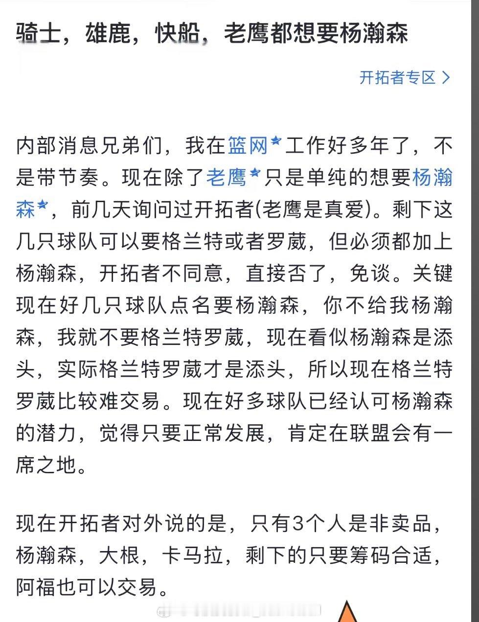 有网友发帖爆出多支NBA球队想要通过交易得到杨瀚森,但是开拓者表示目前杨瀚森是非卖品,大家觉得这个信息靠谱吗?