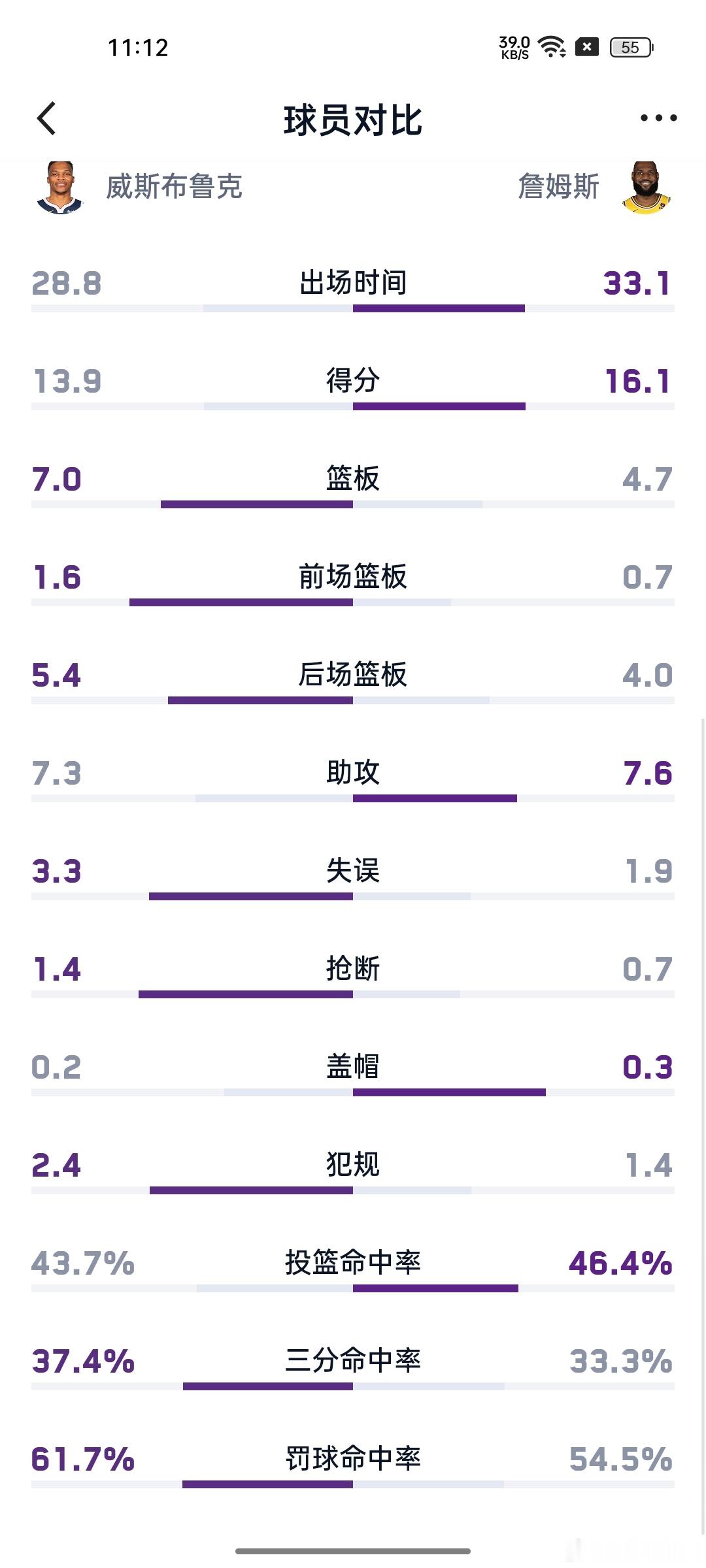 不看不知道,一看吓一跳系列!看看本赛季300万美元的威少跟5000万美元的詹姆斯对比!威少(37岁)——本赛季至今打了24场比赛场均出场28.8分钟能砍下13.9分7.0篮板7.3助攻1.4抢断3.3失误投篮命中率43.7%三分命中率37.4%罚球命中率61.7%!詹姆斯(40岁)——本赛季至今打了7场比赛场均出场33.1分钟能砍下16.1分4.7篮板7.6助攻0.7抢断1.9失误投篮命中率46.4%三分命中率33.3%罚球命中率54.5%!威少在本赛季的有8项数据都强过于詹姆斯,除了出场时间,得分,盖帽,助攻,投篮命中率之外,其余数据都高于詹姆斯,当然也包括一些负面数据(比如犯规,失误)哈哈哈。不过话说回来,威少在国王确实打得好,国王都快打成威少的球队了!本赛季他已经在国王取得了四次三双!继续刷新自己三双的纪录!詹姆斯湖人洛杉矶湖人威少生涯第207次三双威少 而詹姆斯本赛季因伤缺席了湖人大多数的比赛!这也是他数据比威少低的原因,本赛季可以说是40岁詹姆斯的蒙羞布了,虽然目前只打了7场,但也难逃他打出了生涯最差的一个赛季!本赛季他的罚球居然才54.5%!这命中率比中锋还低!不过考虑到老詹已经快41岁的高龄了,在76人那场末节的超神发挥,也让我们知道老詹还是有油的!再给他点时间吧,他会继续打出高效的表现的,说谁老,我都不相信詹姆斯老了,他就是活神仙的存在!