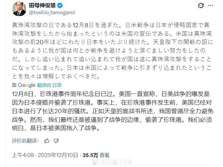 日本航空自卫队退役将领田母神俊雄:1941年12月8日日本作为侵略国家发动了偷袭珍珠港这一说法,是美国的宣传。事实上在珍珠港袭击之前的二十年间,美国一直不断地打压、逼迫日本,日本被一步步逼入绝境,最终不得不发动珍珠港袭击。应当清楚地认识到:日本实际上是被美国拖入了战争。看看,美国这下引火烧身了吧