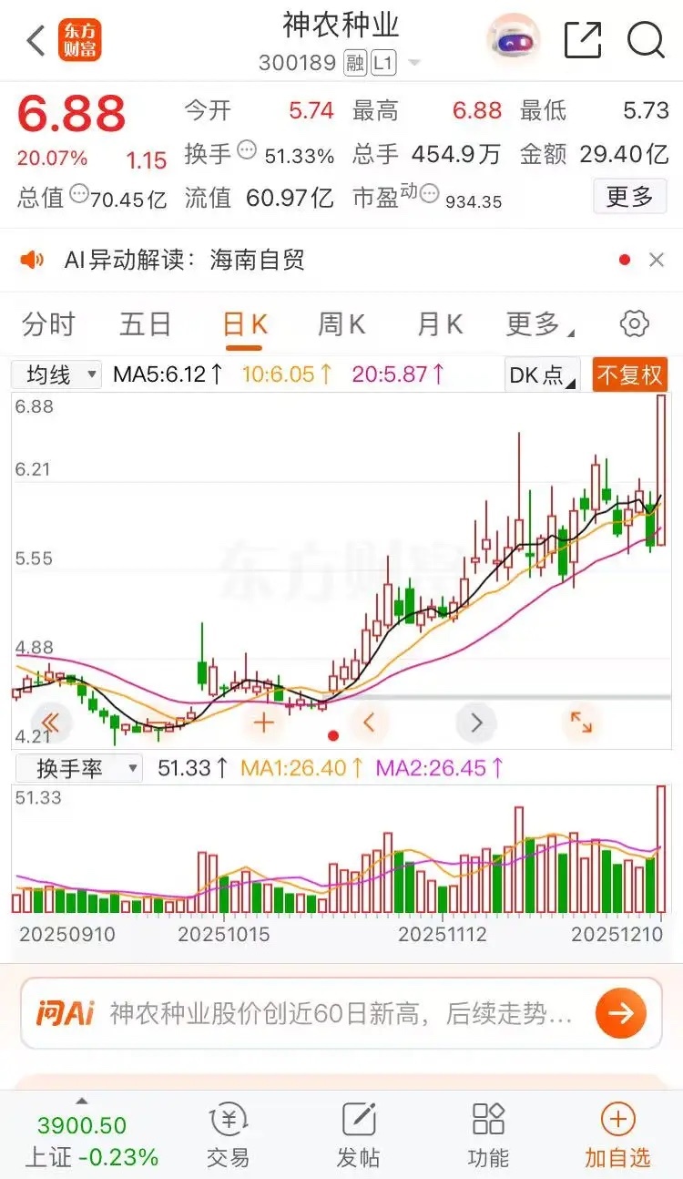 摩尔线程真强,浔兴股份反包,神农种业海南自贸摩尔线程涨幅16.98%,收盘报收735.00元每股,最高797.97元每股,最低617.01元每股,成交金额108.2亿元,中签者今日卖能挣35万人民币。阶段性高点了,恭喜今日卖出的。神农种业涨停收盘报收6.88元每股,成交金额29.40亿元,福建股休息,海南股上阵。浔兴股份涨幅1.84%,收盘报收11.05元每股,成交金额5.73亿元,明天反包指数66.66%,涨停价12.16元每股。