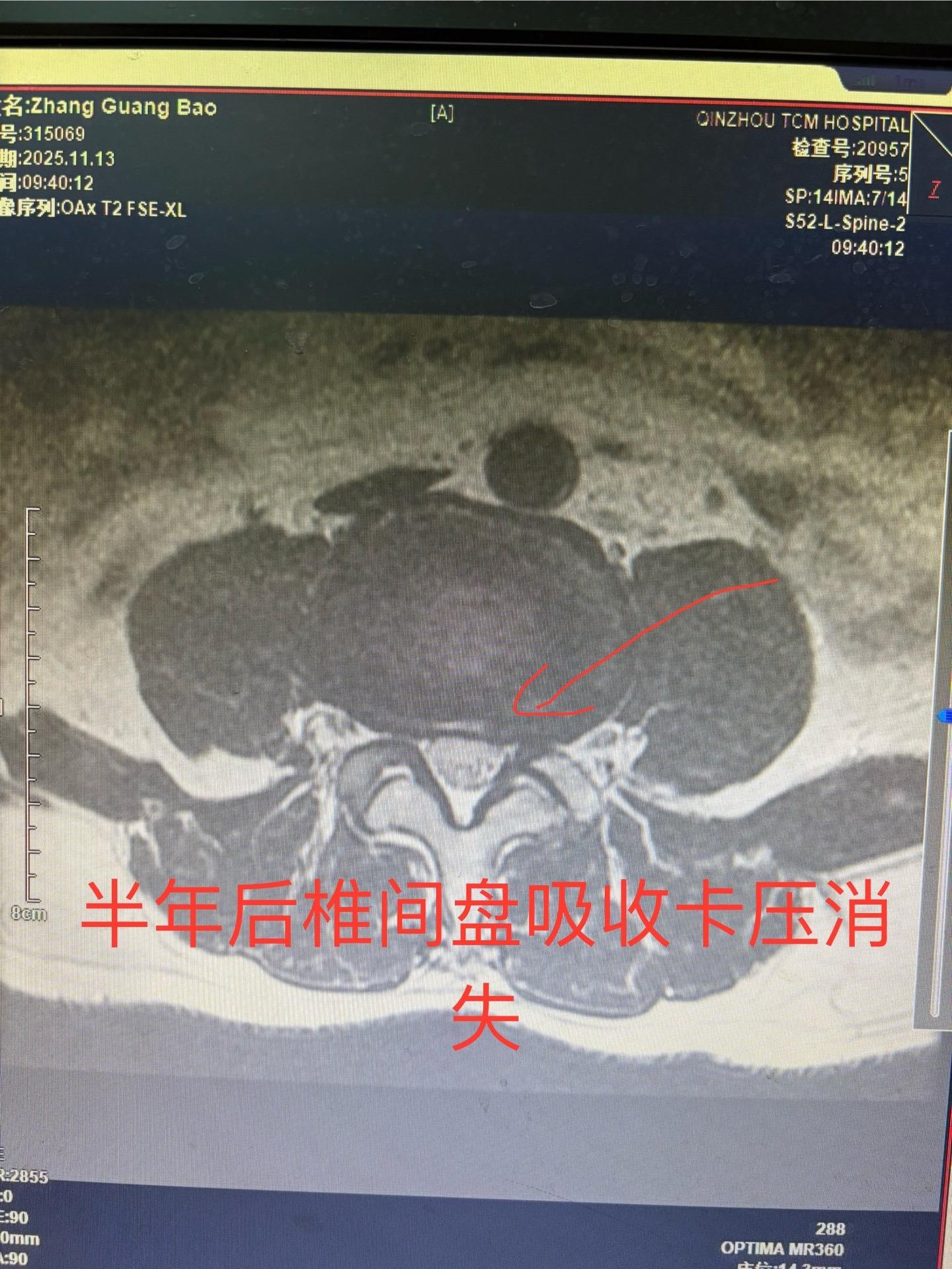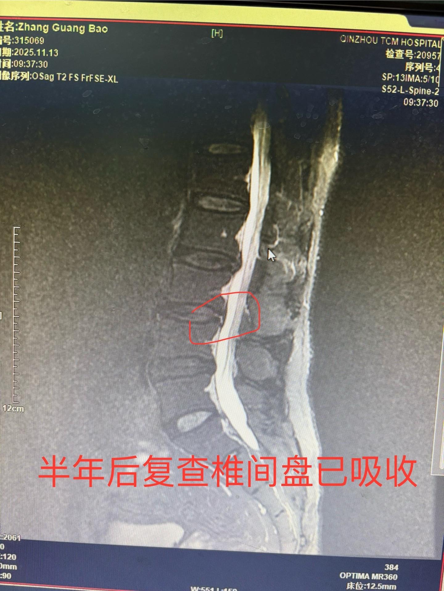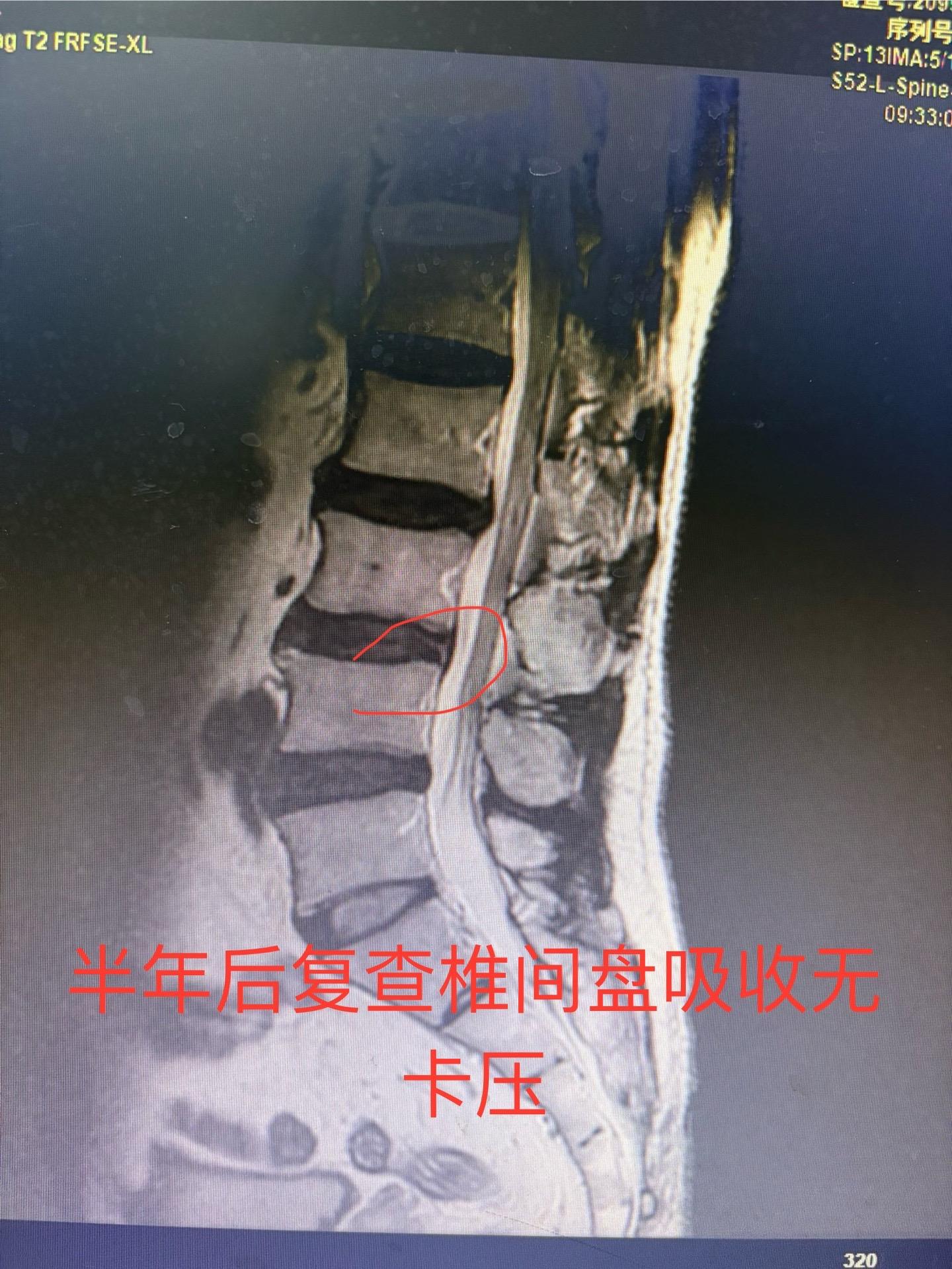 前段时间发现一例椎间盘突出病人保守治疗突出自行吸收,最近又发现一例治疗半年椎间盘突出已自行吸收,证明这不是个例。有部分人确实可以自行吸收,人的人体是很神奇的