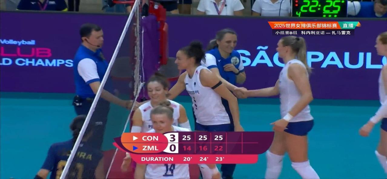 今天凌晨结束的一场2025年女排世俱杯B小组比赛中,卫冕冠军科内利亚诺以3:0(25:14、25:16、25:22)轻松战胜第二个对手扎马雷克取得两连胜,本场比赛因虽然对手实力较弱,科内派出了除齐里切拉外的替补阵容,但还是轻松拿下,12月12日00:30科内将迎来小组赛最后一个对手乌贝兰迪亚海滩。