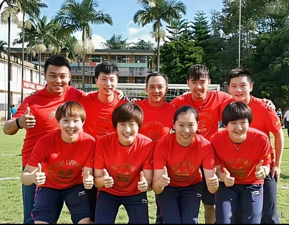 那时的樊振东目若朗星,英姿昂昂!气宇轩昂的王皓,高大修伟的马龙,一个比一个阳光,一个比一个帅!前排有明眸善睐的李晓霞、细眉飞扬的陈梦,那时的国乒队员纯真纯洁,笑容里没有一丝杂念,更没有站C位之说,那时拍照是开心,训练是长技术,比赛是为国争光。而前排左边两个留着蘑菇头的是谁?俏皮、天真、活泼,真是可爱极了!
