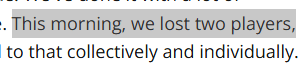 今天早上,我们又有两名球员(出现问题),但我非常欣赏球队整体和个人对此的反应。