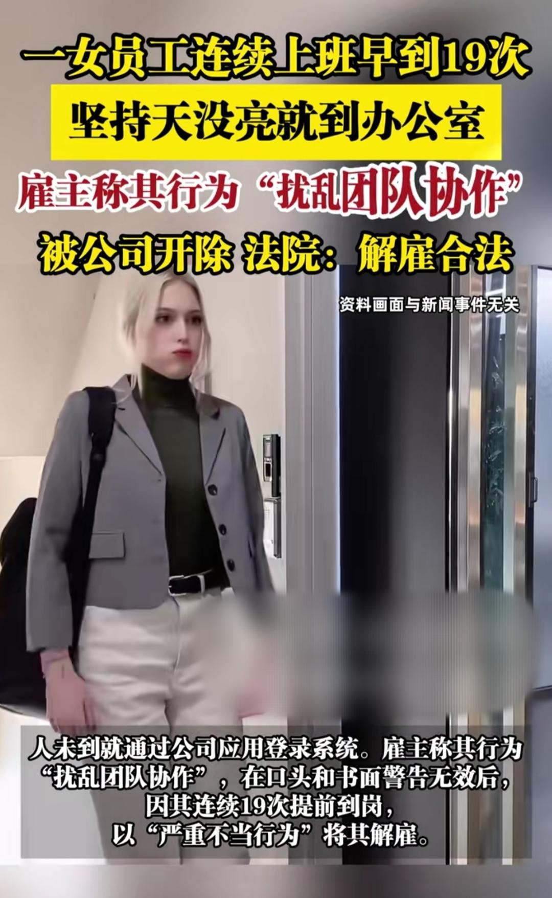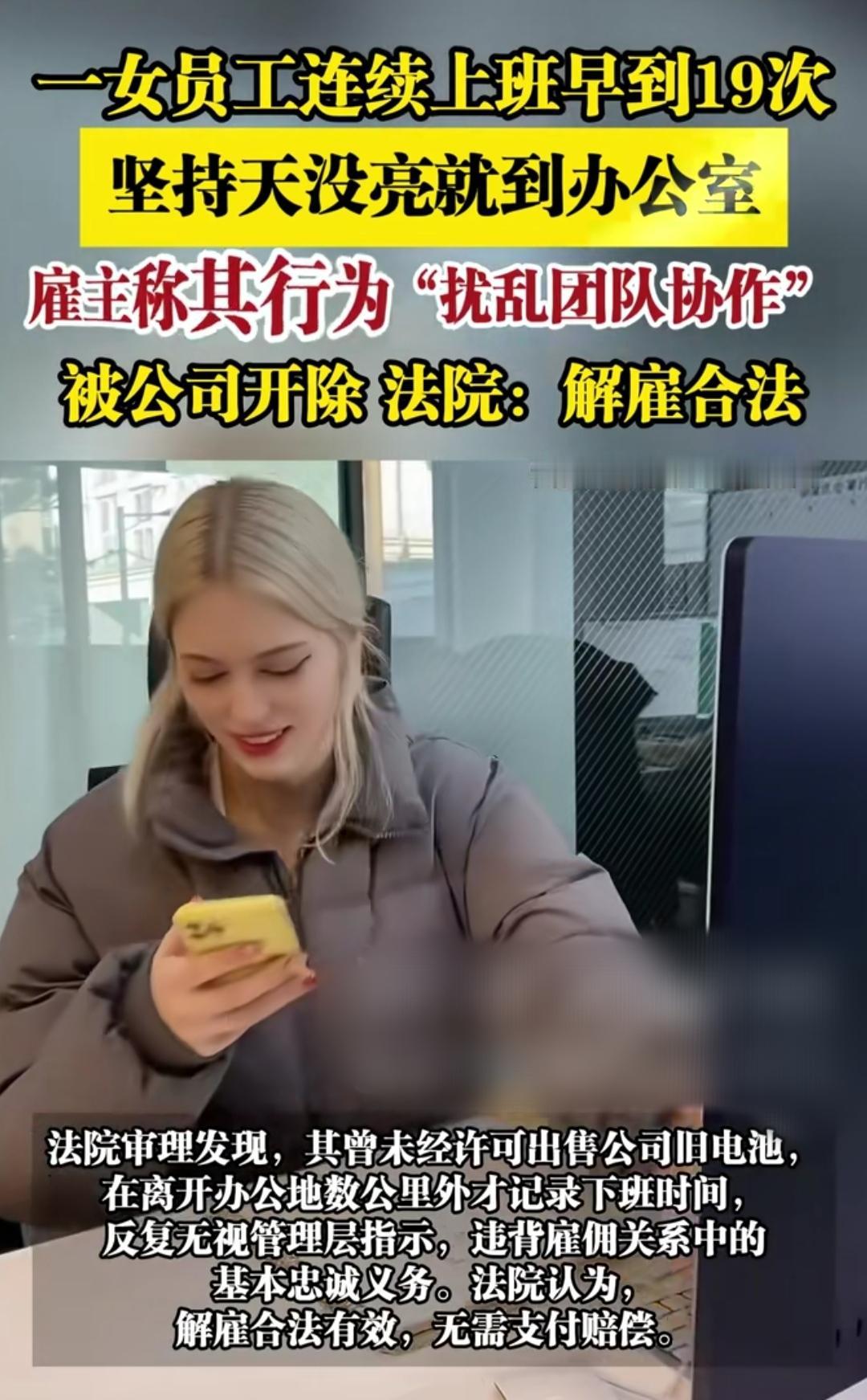 天没亮就蹲办公室,这“勤奋”真能换升职?规定上班时间是7:30,她却天天6点多就蹲在门口,打卡机都快被她按热了——你说这算敬业,还是添乱? 西班牙有位22岁姑娘,就因为坚持天没亮就到办公室,被公司警告好几次都不听。后来公司发现,她不仅提前打卡,还偷偷卖公司旧电池,下班跑到几公里外才打卡,团队协作全乱了套。法院一查,这哪是勤奋,分明是把公司规矩当耳边风!最终判公司开除合法,一分赔偿都不用给。 咱打工人总想着“多干点活儿总没错”,但职场不是凭感觉干事的地方。真正的敬业,是守着规矩把事儿做好,不是搞自我感动那一套。你觉得,这姑娘是真傻,还是太把自己当回事儿?