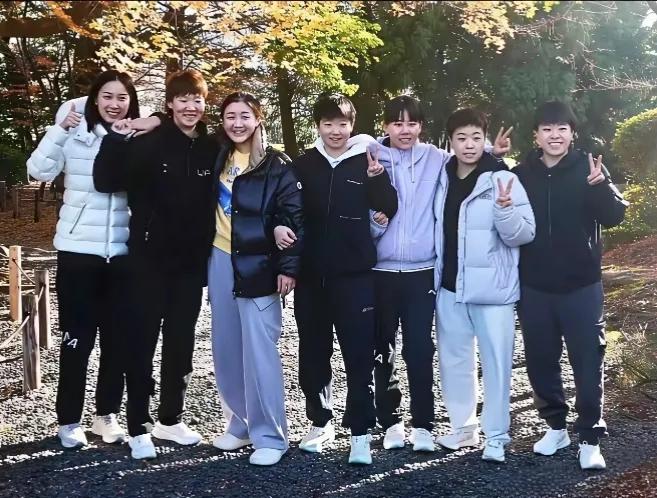 7位乒坛女将同框:我只认出了金发覆额的王曼昱,笑容甜美的陈梦,萌亲萌亲的孙颖莎与头发帘齐肩的陈幸同,左一那位长发美女与右侧这两位实在没认出来,你知道是谁吗?