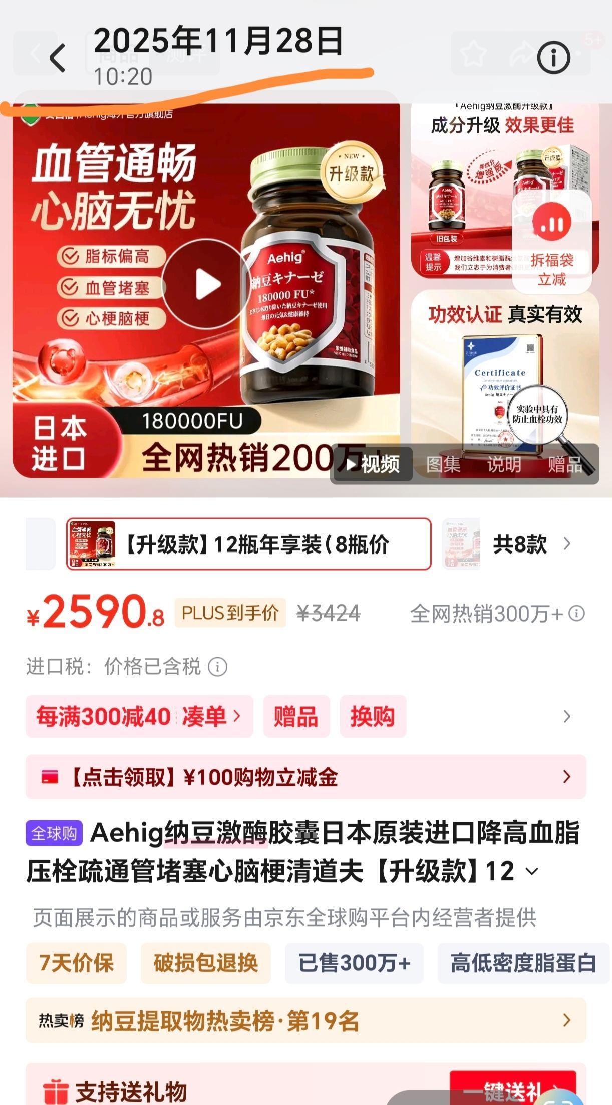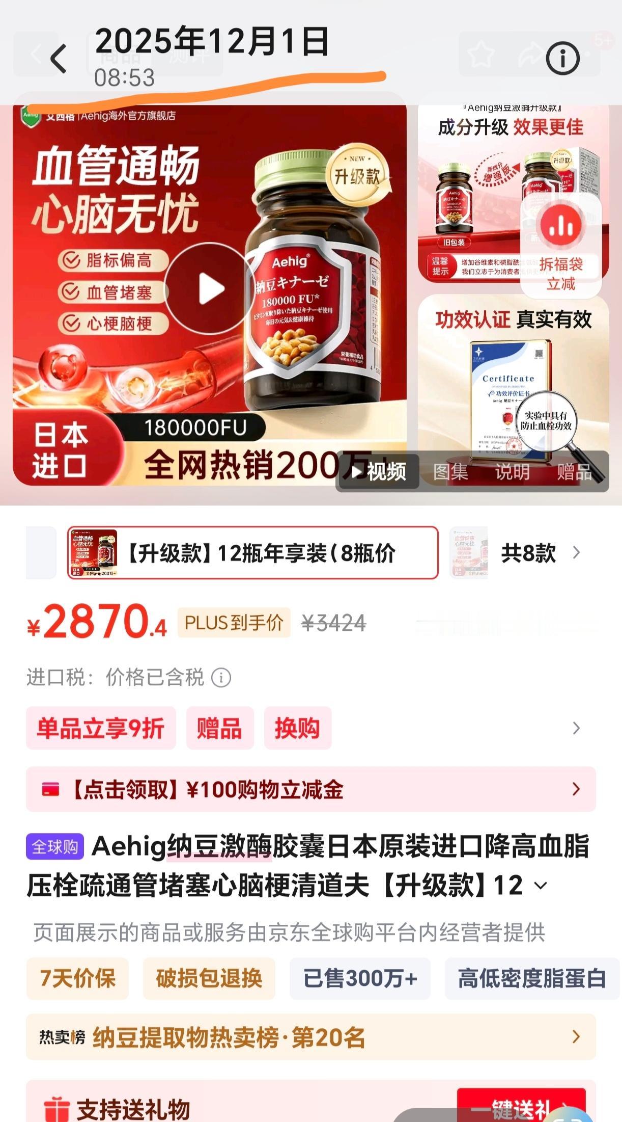 从双十一后的突然涨价,到12月1号再次到达涨价顶峰,如今快要双十二了,价格促销后,2489元。 不得不说,买的没有卖的精,商家和主播说过的亏本大甩卖,可能只是盈利少点,但绝对不至于亏本!!! 我个人觉得这款纳豆激酶对有心脏病,心脑血管的老人是有好处的,还是有些疏通血管的作用,我奶奶从2022年开始使用,跟同龄人,跟同龄人相比,精神状态都有些不一样。 有没有治疗心脑血管的其他神药呢?欢迎大家力荐双十一双十二买的东西 双11低价 双11囤货价 双11折扣品 双十二囤什么 双11价格陷井 双11必买零食 双十二抄底价 纳豆激酶 食品纳豆激酶 纳豆基酶 食品纳豆激酶 纳豆基酶 纳豆粉 纳豆红曲提取物 纳豆精华 纳豆激酶红曲片 纳豆益生菌粉
