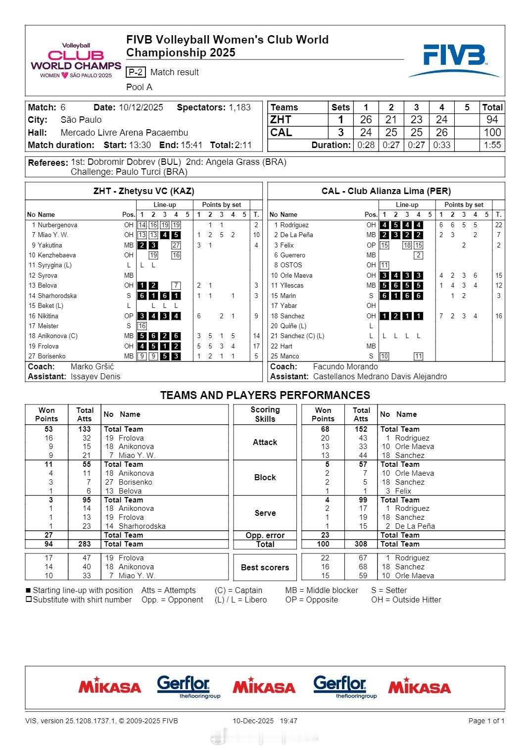 【女排世俱杯秘鲁利马3-1力克哈萨克七河 缪伊雯10分】国际排坛战报速递中国排球留洋动态 12月10日巴西圣保罗,2025女排世俱杯A组,秘鲁利马3-1(24-26/25-21/25-23/26-24)力克哈萨克斯坦七河,取得首胜,后者两连败。罗德里戈兹22分、桑切兹16分、奥勒-马耶娃15分、伊莱斯卡斯12分,弗罗洛娃17分、阿尼科诺娃14分、缪伊雯10分(21扣9中1拦)。