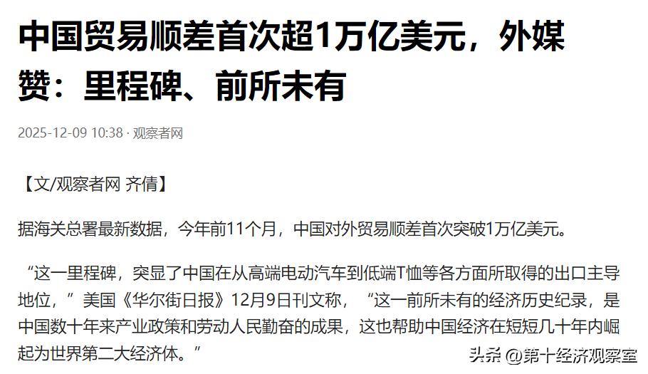 外贸顺差过高,并不是什么好事 根据海关总署的数据:1-11月份,我国货物贸易顺差总额达到了7.71万亿人民币,折合1.08万亿美元,继2024年之后,再次提前完成了全年贸易顺差超 1万亿美元的“目标 ”。 我看很多人对于这个1万亿,只有亢奋和狂赞,但没有意识到这背后的“隐忧”。一方面,由于内需扩大的乏力,近些年我们更多的把“出口”作为拉动经济的良药。 我们在用全球30%的制造业产能供养世界,却让自己的钱包始终鼓不起来。 2018年前后,国内消费引擎突然失速,居民可支配收入占GDP比重长期停留在43%,远低于全球60%的平均水平。 当房地产虹吸了居民60%的财富,医疗、教育、养老三座大山又逼着普通人把31.3%的收入锁进银行——2025年家庭储蓄总额突破140万亿,相当于每个中国人存了10万元,但这不是财富积累,而是对未来的恐惧。 为了稳住这1.2亿出口就业岗位,汇率成了最沉重的砝码。IMF测算显示,人民币实际购买力早该突破1美元兑3.5元,但为了让苏州的纺织厂、东莞的电子厂维持微薄利润,汇率被"有管理"地锚定在7元区间。 这种人为低估的代价,是每个中国消费者在为全球买单:德国车企在中国卖一辆车多赚30%,美国超市的玩具标价只有生产成本的1.5倍,而我们进口的芯片、原油,每单都要多付20%的隐性关税。 2024年,仅进口能源一项,企业和家庭就多掏了8000亿人民币,这些钱足够让14亿人每人每年多买200斤猪肉。 更严峻的是,这种"补贴式出口"正在掏空产业升级的后劲。2025年新能源汽车出口激增67%的光鲜背后,是欧洲车企联合游说的35%关税大棒。 当我们用汇率优势抢占市场时,德国正把30%的利润投入固态电池研发,日本在氢能源赛道悄悄布局。这种"用价格换市场"的老路,正在重蹈2008年的覆辙——当年4万亿刺激留下的产能过剩阴影,至今仍在钢铁、光伏行业徘徊。 更致命的是,持续的顺差让3万亿美元外汇储备沦为"烫手山芋",2024年美联储加息期间,中国持有的美债市值蒸发了1200亿美元,相当于安徽全省一年的GDP。 内需乏力的根子,藏在城市化的"夹生饭"里。67%的常住人口城镇化率下,2.8亿农民工仍带着"过客"心态:没有户籍的他们,在城市赚的每一分钱都想着叶落归根。 当马克龙抱怨"中国不再进口欧洲高端设备"时,他没看到上海临港的特斯拉工厂里,95%的零部件已经国产化;当美国用芯片禁令"平衡"贸易逆差时,他们选择性忽视中国半导体企业每年15%的研发投入增速。 这种"想买的买不到,能买的不愿买"的错位,本质上是中国制造业升级的必然代价——2025年机电产品占出口比重58.6%,意味着我们正在告别"8亿件衬衫换一架飞机"的时代,但代价是贸易平衡的自然打破。 站在2025年的节点回望,万亿顺差更像是一张吊瓶的账单:当出口这剂"强心针"注射了十五年,内需的免疫系统已经萎缩。2008年金融危机时,4万亿投资尚能拉动基建马车,如今房地产饱和、地方债高企,投资边际效益只剩2008年的1/3。 更紧迫的是,全球35%的反倾销调查指向中国,东南亚制造业正在以每年12%的增速分流订单——当越南的电子厂开始承接苹果耳机组装,我们终于明白:靠汇率补贴的出口盛宴,终究喂不饱14亿人的胃。 这场困局的破局点,藏在居民收入的"蛋糕重分"里。2025年中央经济工作会议罕见提出"提高劳动报酬在初次分配中的比重",这不是简单的涨工资,而是要让快递员、流水线工人的腰包鼓起来。毕竟,一个能让14亿人放心花钱的市场,才是抵御全球风浪的定海神针。