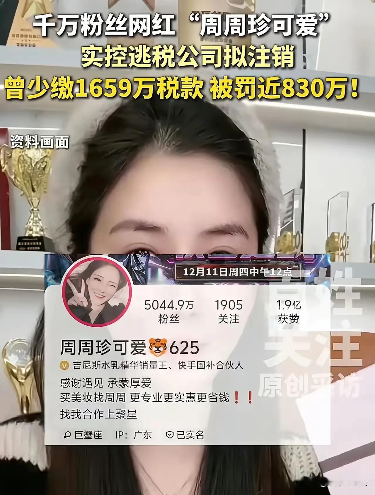 5000万网红“周周珍可爱”此刻心情, 估计比吃了苍蝇还要难受。 本来以为偷税漏税1659万,只要偷偷 注销公司就会瞒过去了,没想到被人实名举报,税务部门介入查处。 涉及金额偷漏税1659万,而公司注销时间刚好卡在12月14日注销截止日期之前,这分明是想好了“金蝉脱壳”这一计,她没想到,这不过是“掩耳盗铃”之举。 税务部门的处罚结果,按50%顶格罚款829.64万...... 这下好了,全网都知道她偷税漏税的事,接下来可能要凉凉了 实在搞不懂她,拥有5000万粉丝又是顶流网红,几场直播下来就能赚到普通人一辈子赚不到的钱,竟然还想着去钻空子,踩不该踩的底线。 现在被查的心情,估计比吃了苍蝇还要难受。 早知如此,何必当初呢,大家怎么看呢?