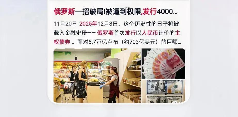 俄罗斯绝境反击!面对西方全面制裁,2025年末俄成功发行300亿元人民币主权债券,利率低廉,直接绕开美元体系。 这步棋妙在哪?既化解国内资金困局、规避制裁风险,更一剑刺向石油美元霸权。 随着俄以国家信用为人民币“站台”,印度、巴西、南非等多国纷纷加速人民币结算与储备。 人民币正成为新兴市场“信用锚”,全球金融格局迎来深刻重构。 对此你怎么看?