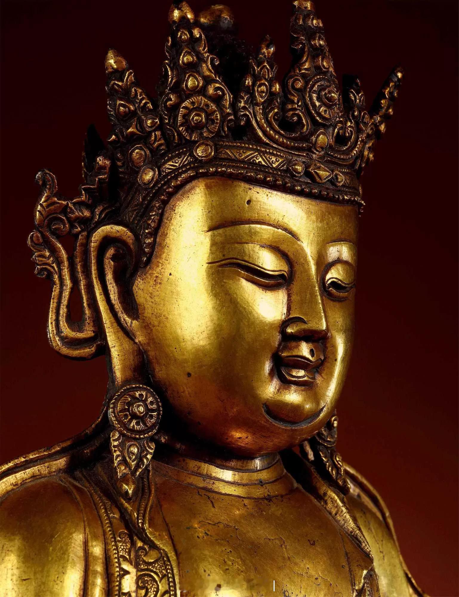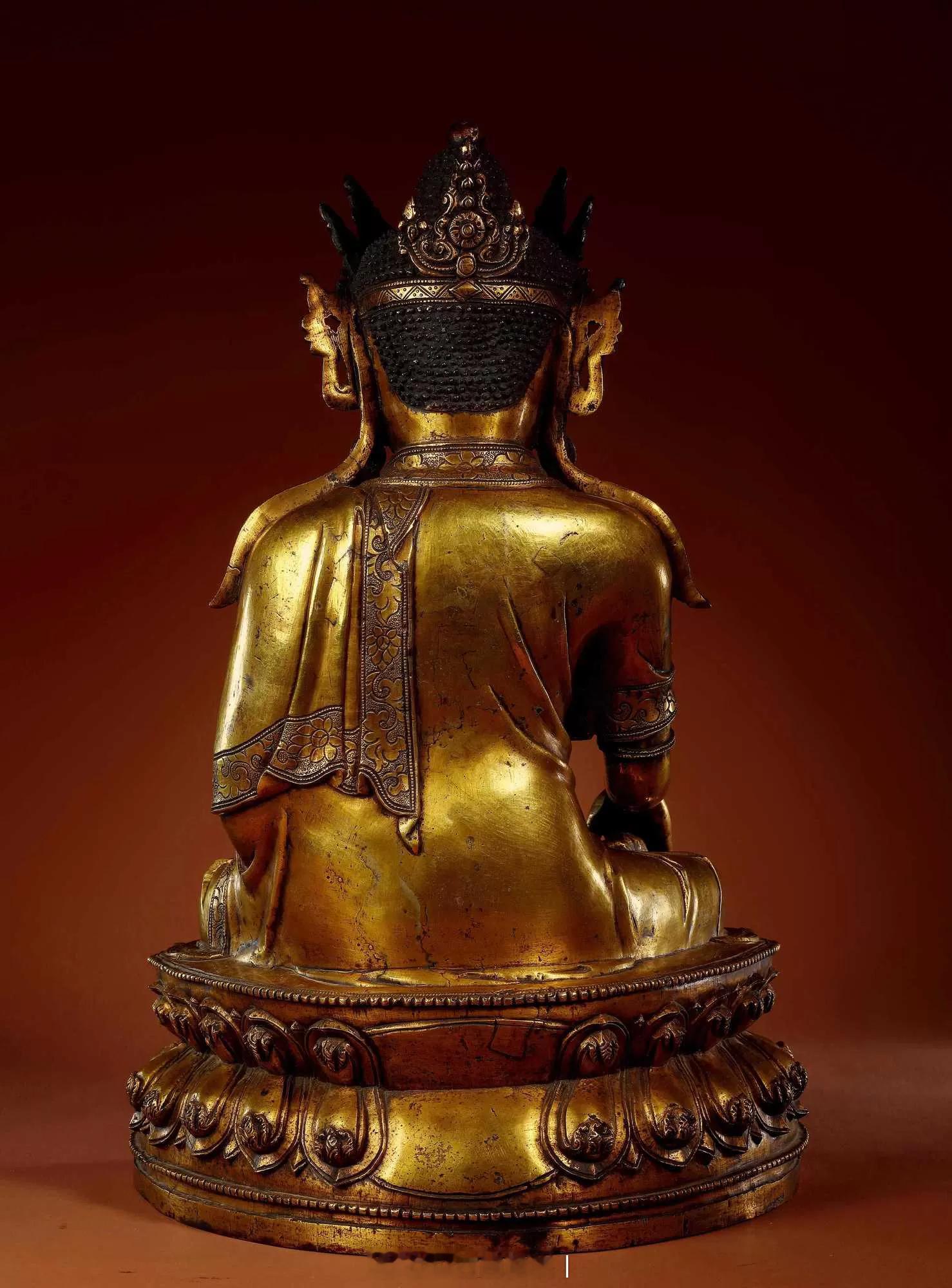 明正统-成化 铜鎏金宝冠释迦牟尼像造像头戴宝冠,肉髻圆隆,饰螺发,宝珠顶严。耳坠耳珰,耳后宝缯上扬,两绺余发披搭双肩。耳珰上部为圆形,中心为六瓣花,下部为花叶。面庞丰满,双目低垂,直鼻小口,下颌圆润,神态安详宁静。身姿端正挺拔,肩部宽阔,腰部收束。颈部雕有三道蚕节纹,四肢佩饰手镯、臂钏、脚镯,右臂上可见花形饰物。上身斜披袈裟,右肩搭偏衫;下身着僧裙,胸前微露僧袛支。左手结禅定印,右手施触地印,跏趺端坐。梯形束腰式仰覆莲座,上下沿均饰联珠纹一周。莲瓣宽肥饱满,对称分布,莲瓣尖端装饰有卷草纹。造像整体端庄大气,雕刻工艺精细,鎏金厚重华美,且体量高大,装饰纹样有永宣宫廷造像遗风,制作年代当距其不远。密教形成之前,佛像仅穿袈裟,不戴任何饰物;形成之后,佛像不仅佩戴宝冠,还在身体各部位佩戴饰物。这种宝冠佛的形象分别传入了印度西北部、中国西藏和中亚地区。此尊佛像在西藏造像艺术的基础上,融入了内地佛教造像的传统审美情趣,侧重对汉人面相特征和脸部表情的细节刻画,强调手脚的柔软度和指节纹路的清晰度。采用内地惯用的写实性手法处理衣裙纹褶,追求厚重、流畅、自然、生动的效果,并在衣缘处錾刻精美的缠枝花卉纹。以上这些特征分别反映出佛教造像艺术在民族化的发展进程中越来越讲究人物造型与服饰搭配的整体艺术效果。尺寸:高49cm来源:保利2025秋拍《禹贡—纵横以和,天府永藏》