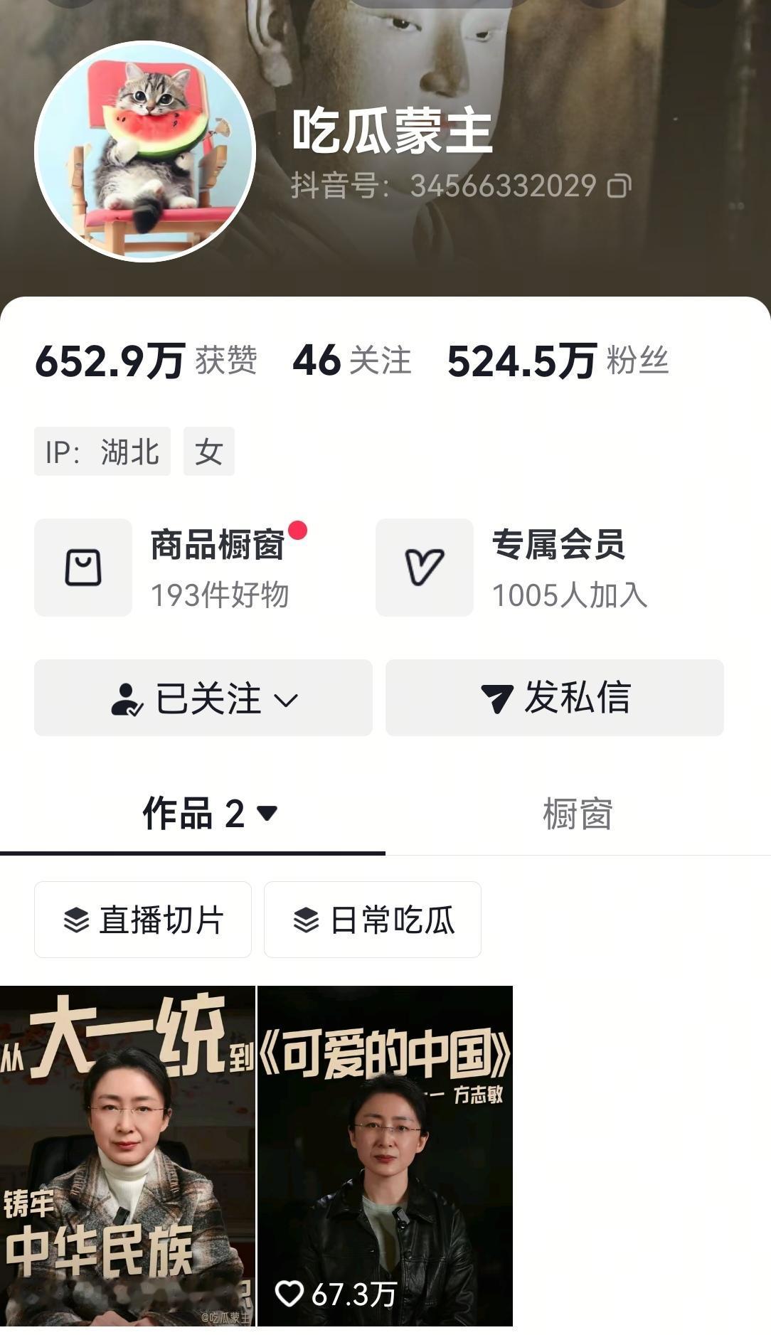说实话那些口口声声说吃瓜盟主自己删掉了视频的人都是睁眼说瞎话。 现在盟主就保留了两个视频,加起来也就是180万的点赞,但她总点赞是652万,多出来470万的点赞就是她以前视频的点赞数量。所以她以前的视频不是删除了,只不过自己隐藏。 意大利炮没出来搞事的时候盟主最多算一个小众直播,她的粉丝也就三十万,结果一个月到现在增加到520万。 这一波你说要不要感谢意大利炮的八辈祖宗呢?