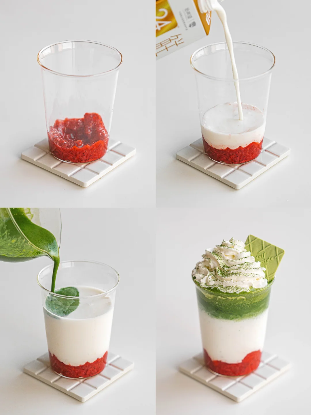 食材:鲜奶|草莓酱|抹茶液|奶油|饼干