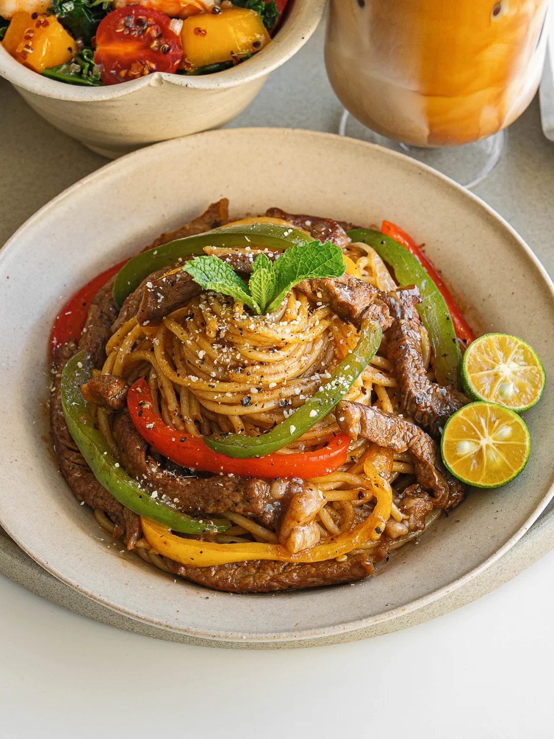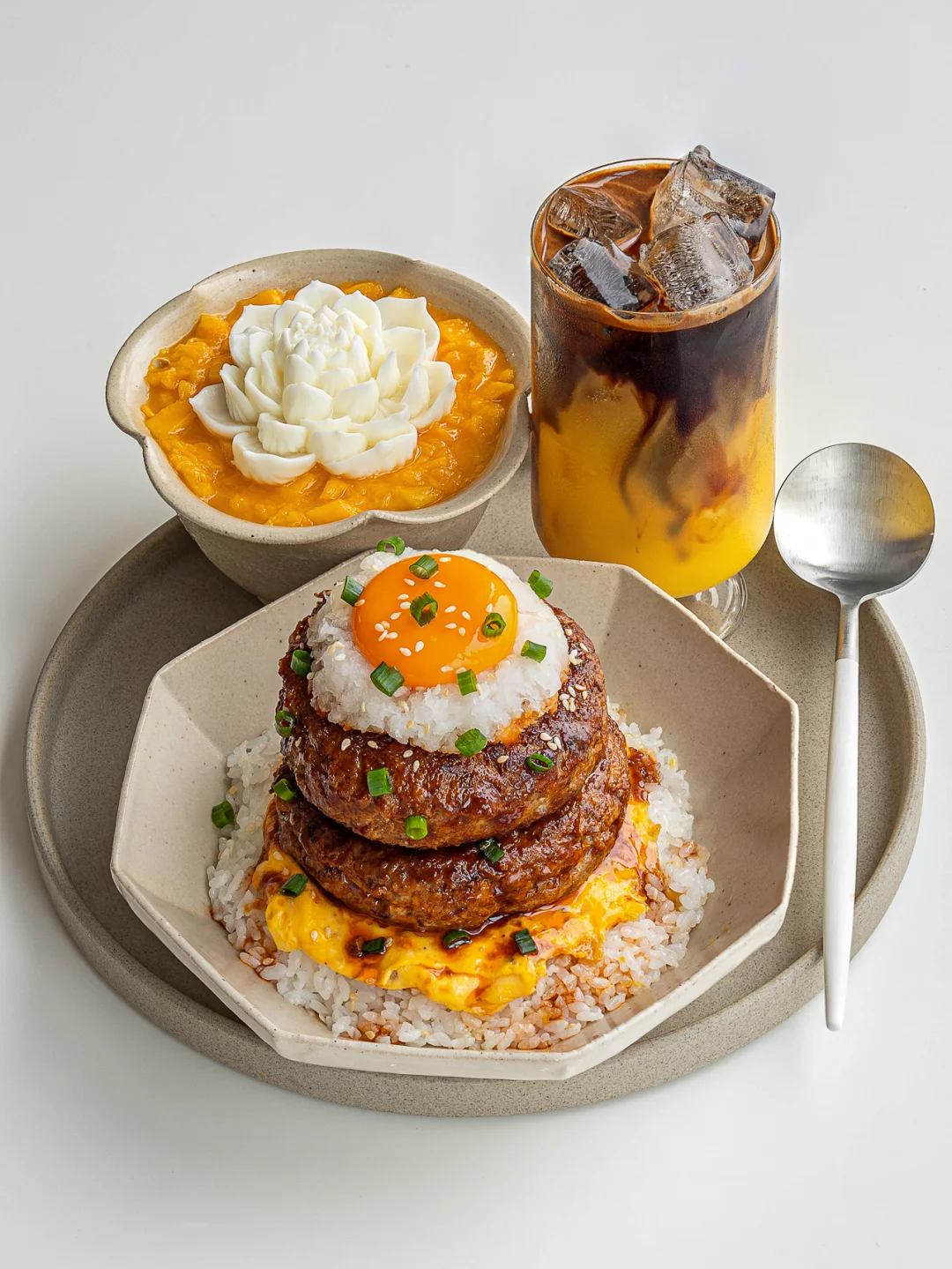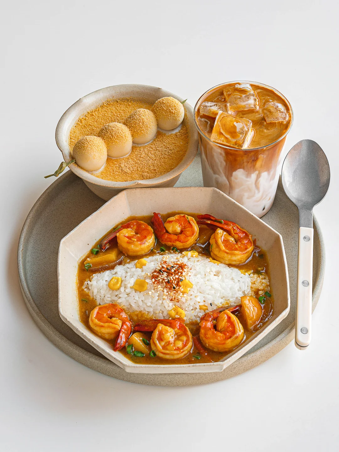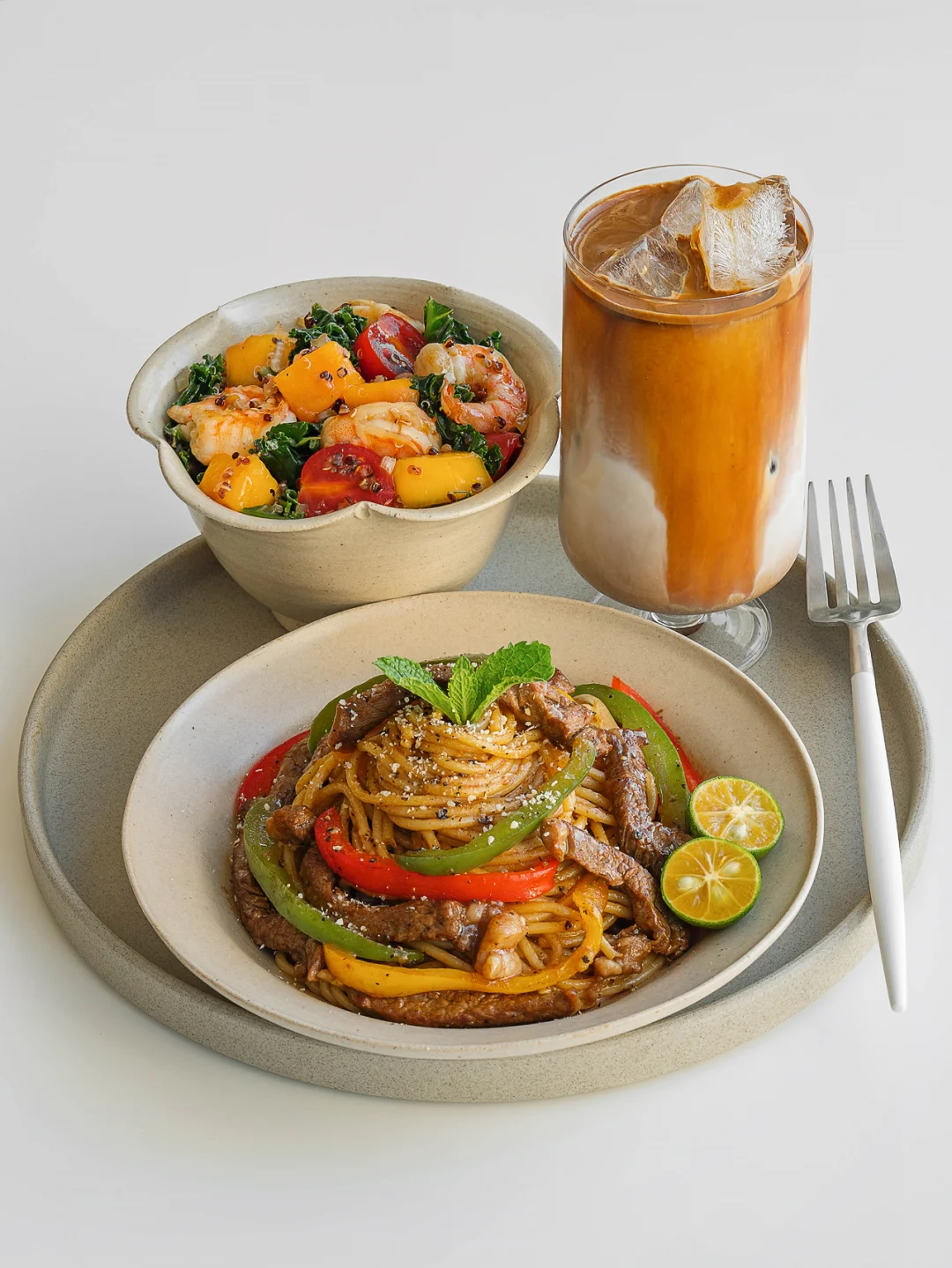 ❶黑椒牛柳意面+鲜虾羽衣甘蓝沙拉+冰拿铁 ❷日式汉堡肉盖饭+芒果奶冻+橙C美式 ❸牛排番茄烩饭+布拉塔沙拉+玫瑰拿铁 ❹苹果大虾咖喱饭+豆乳布丁+冰拿铁