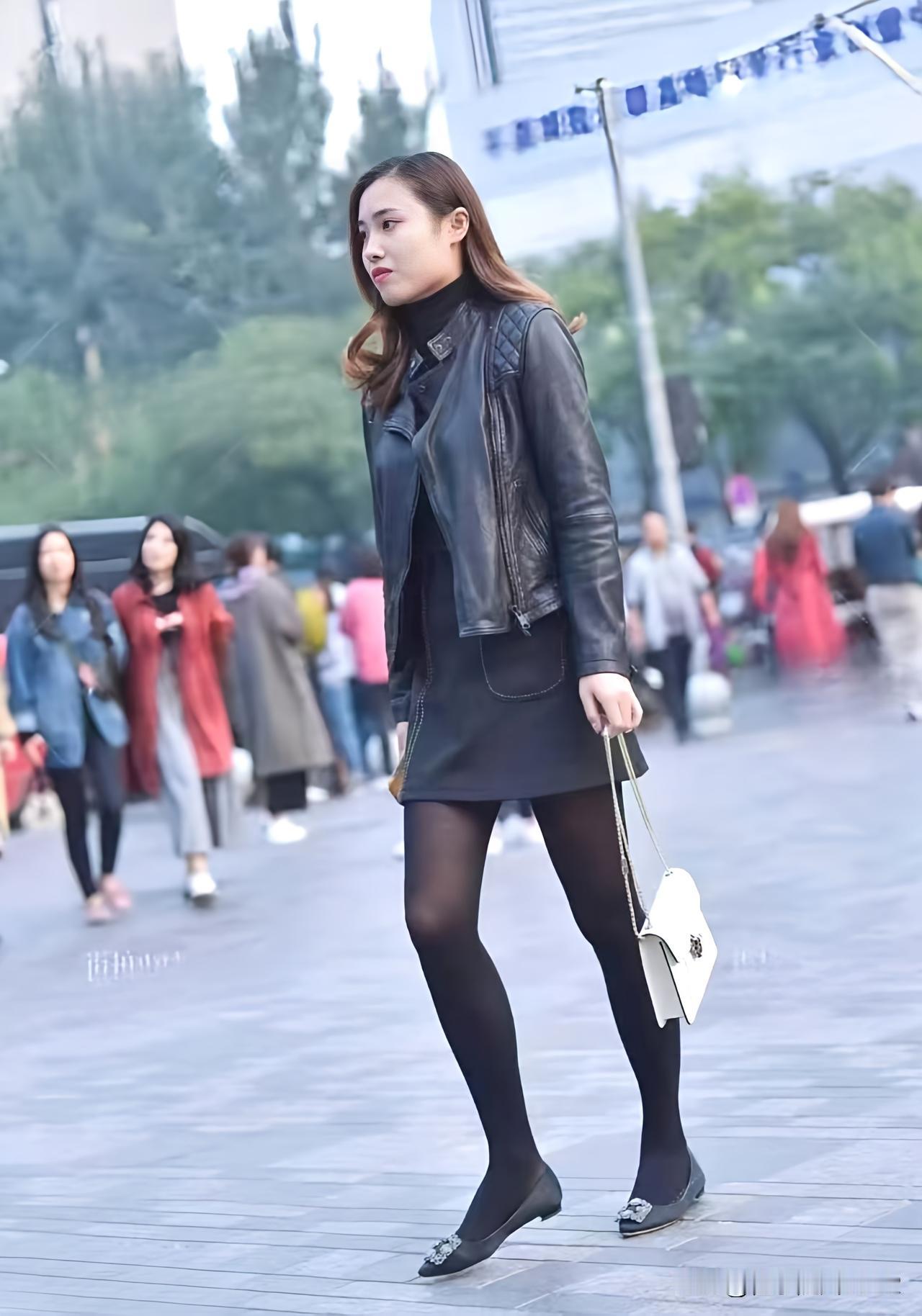 都市街头时尚穿搭,黑色皮衣短裙,自信步伐