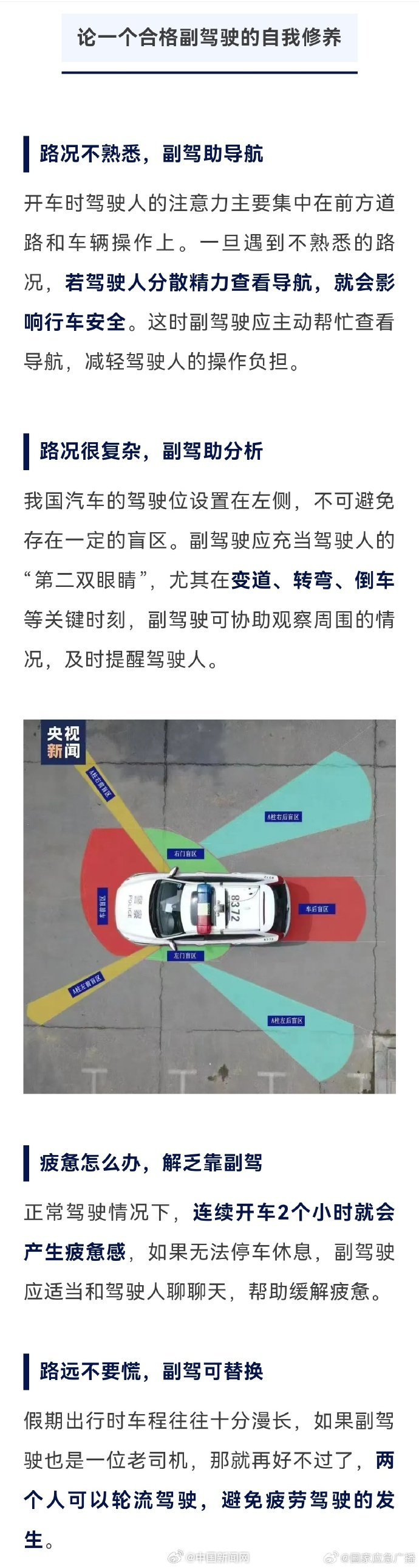 【一个合格副驾的自我修养】副驾在驾驶过程中起到辅助作用,路况不熟悉,副驾助导航;路况很复杂,副驾助分析。副驾位置很重要,那一个优秀的副驾驶应具备哪些素质?坐在副驾上什么事情一定不能做?戳图详细了解不开车为啥还被称为副驾驶