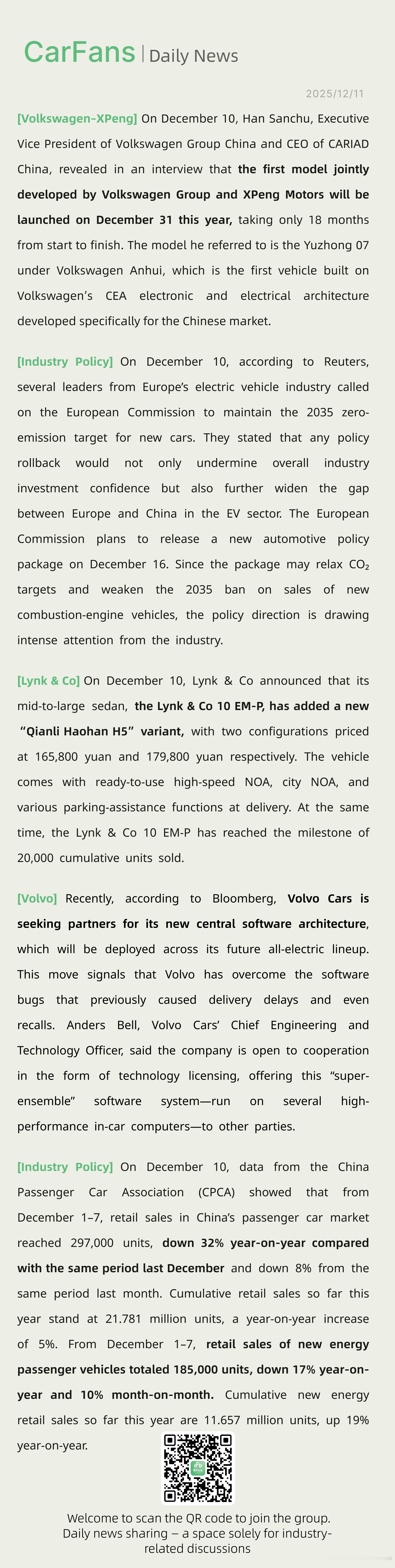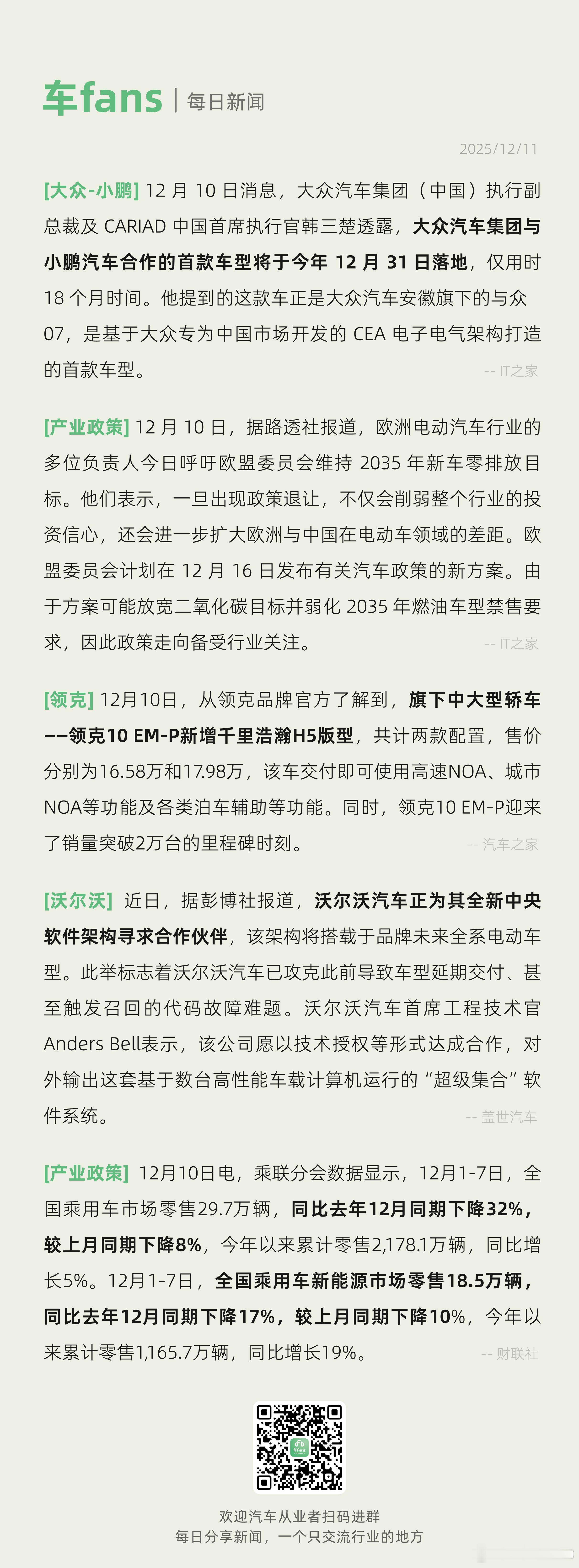 大众与小鹏汽车首款车型31 日落地、沃尔沃为其全新中央软件架构寻求合作伙伴大众汽车集团(中国)执行副总裁及 CARIAD 中国首席执行官韩三楚透露,大众汽车集团与小鹏汽车合作的首款车型将于今年 12 月 31 日落地,仅用时18 个月时间。他提到的这款车正是大众汽车安徽旗下的与众07,是基于大众专为中国市场开发的 CEA 电子电气架构打造的首款车型。一时合作一时爽,一直合作一直爽新能源汽车