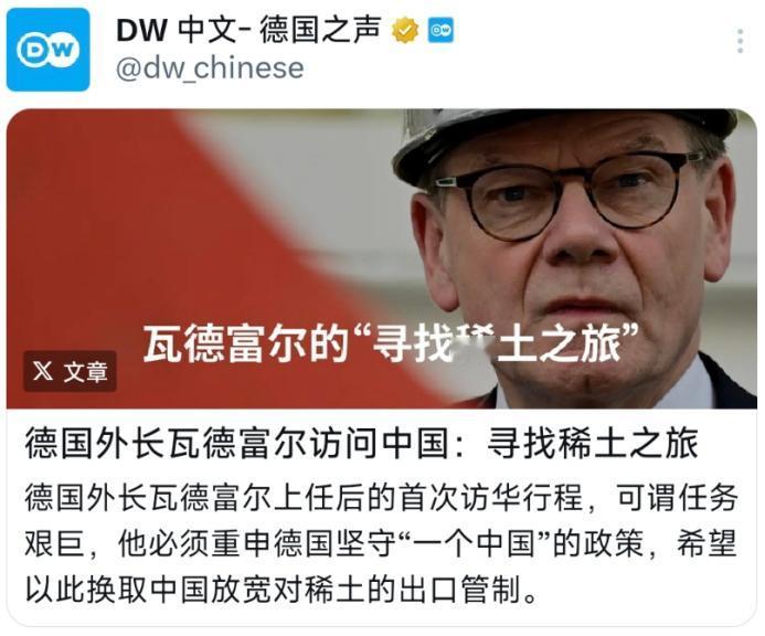 12月10日,德国之声发布:“德国外交部长瓦德富尔访问中国:寻找稀土之旅。德国外长瓦德富尔上任后的首次访华行旅,可谓是任务艰巨,他必须重申德国坚守‘一个中国’的政策,希望以此换取中国放宽对稀土的出口管制。”   说白了,他们发布出这条消息,凸显出了中国稀土对世界各国的重要性。   要知道,一个国家的工业发展离不开稀土,而中国是世界上唯一一个全套稀土产业链的国家,并且手握全球顶级的稀土开采、提纯技术,就像高志凯说的:“中国的稀土和中国的瓷器一样,是别的国家百年都难追赶的。”   说实话,德国现在的态度,根本就不像是来求中国放款稀土的,更像是拿着“一个中国”的条件来谈判的,好像承认这一事实,是多么难的事情一样,要知道,历史上有多份文件可以证明台湾是中国的一部分,这是联合国都承认的事实,而德国这样的行为,只会疏远两国的关系。   如果真心实意来求中国放宽稀土出口,大概率和中国的谈判会很顺利,但是如果是这个态度,就很有可能无功而返。   说到底,“一个中国” 原则是国际社会公认的事实,更是中德开展任何合作的前提和基础,绝非可以用来讨价还价的筹码。而两个国家的合作,也应该是建立在平等、尊重的基础上的,如果德国不知悔改,最终只会毁坏自身的利益,错失这次的合作机遇,让自身陷入供应链的困境。