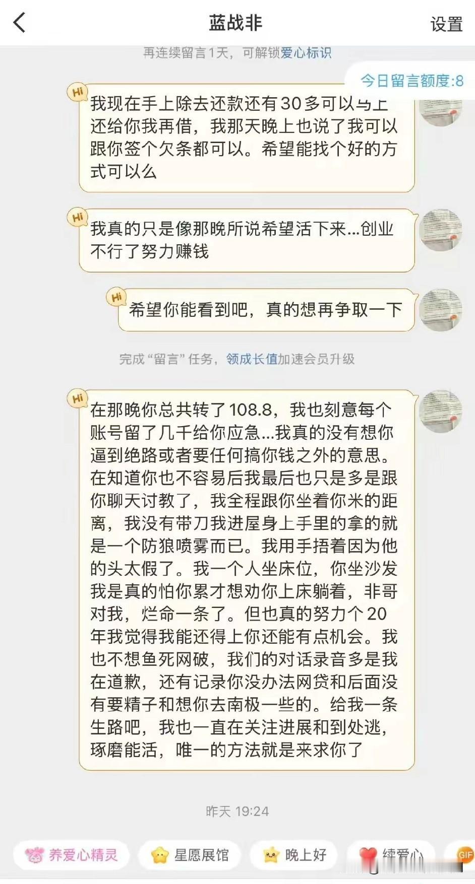 我预料到了绑匪会落网 也预料到了案情能查清 万万没想到是以绑匪自曝的方式 这个自称绑匪的网友在会员群里的千字长文,把一场跨国绑架案变成了罗生门。他说自己因炒股欠债临时起意,否认半年布局的说法,强调全程独自作案且未持刀,只是用防狼喷雾吓唬人。这和蓝战非描述的三人持刀团伙截然不同。 更微妙的是绑匪的道歉姿态。他承认转账108.8万,却坚持说是蓝战非自行操作,甚至自称已到卡塔尔大使馆自首求遣返。但细看就会发现矛盾点:若真为临时起意,何来提前蹲守机场三天的耐心?若真无伤害意图,何必准备防狼喷雾和道具枪? 蓝战非此刻正在前往南极的旅途中。他可能没想到,绑匪会用这种自曝的方式打乱后续追责。当犯罪细节变成网络谈资,真相反而在舆论狂欢中越飘越远。头号创作者激励计划