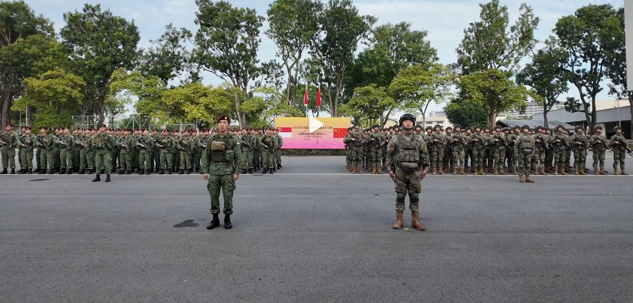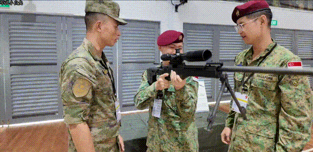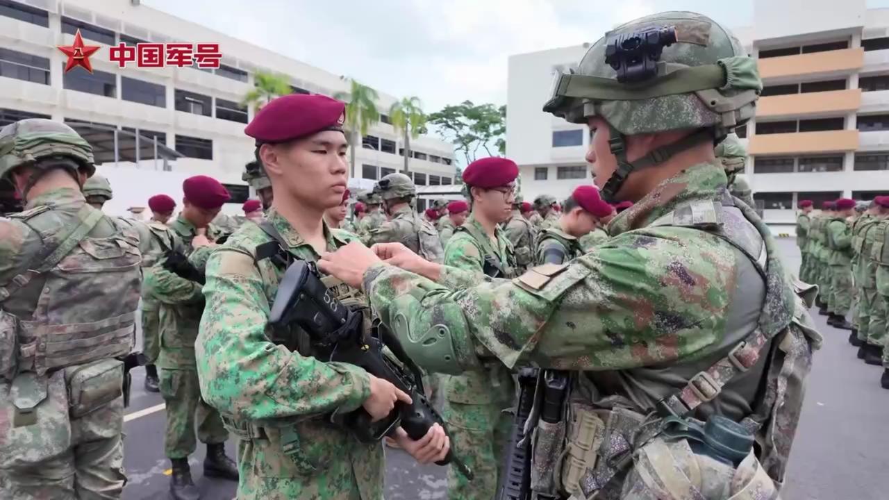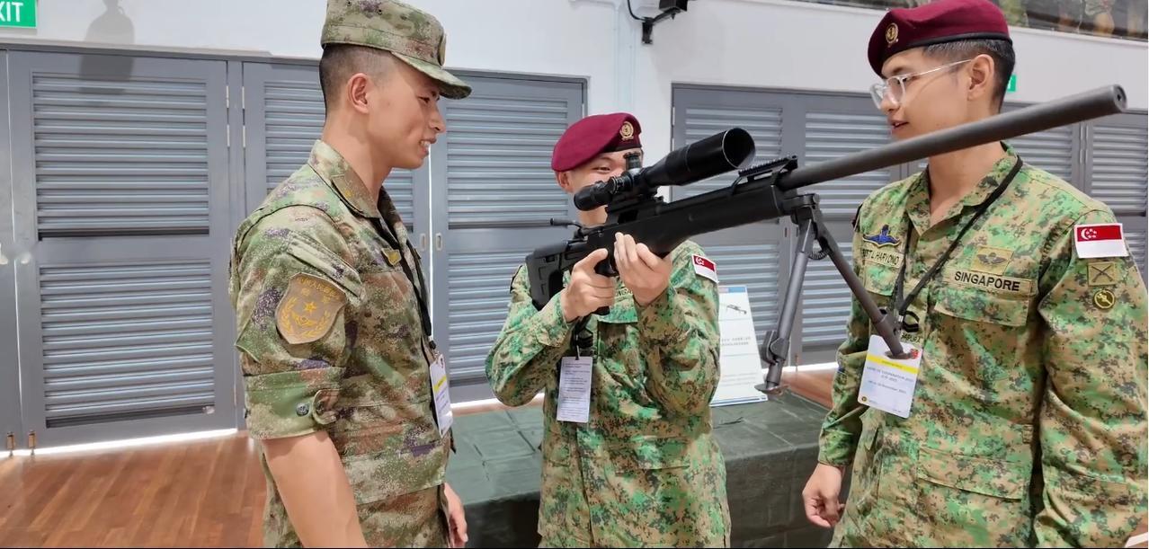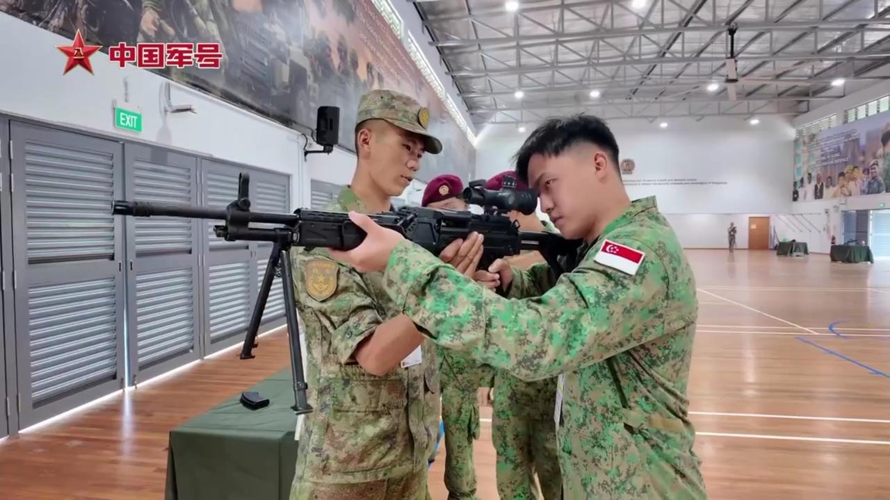 中新“合作-2025”陆军联合训练10日上午在新加坡裕廊某营区开始,双方队员体验对方轻武器。