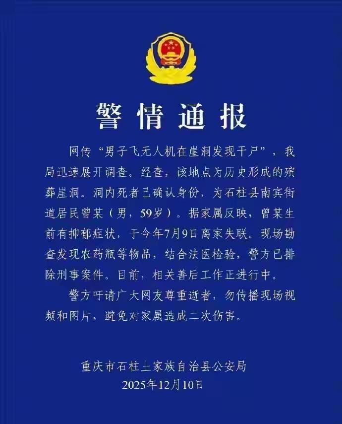还记得“男子飞无人机在崖洞发现干尸”这件事吗,终于找到家属了,说起原因真的很让人心酸。 12月4日,有一航拍爱好者用无人机在重庆一崖洞发现有一具“干尸”,发现后报警并上传了视频。 家属看到后联系上了这位航拍者并表示感谢,崖洞内的“干尸”是自己的父亲。 女儿说平日里父亲不善言辞,在工地受过伤,已经干不了重活,长久之下认为自己已经是个负担,以此患上了抑郁症,于是只带着一条毛毯和一瓶农药进了此崖洞,了解了自己的生命。 至于没经过验证DNA就相认,死者儿子给出了答案,他说从穿着的衣服和手机已经能确认就是父亲了。 从官方通报来看,该死者身份已确认,是个59岁男性,此崖洞是历史形成的殡葬崖洞,家庭住址也已确认。 看了此通报,真的是很感慨也很心酸,都说父爱如山,这位父亲到临终都不想拖累自己的孩子,真的很伟大。 父亲们都不善于用语言表达自己的爱,但总想把最好的给我们,老了老了也不想成为我们的负担,这就是父爱。这位父亲被发现也算是冥冥之中,现在总算能入土为安。