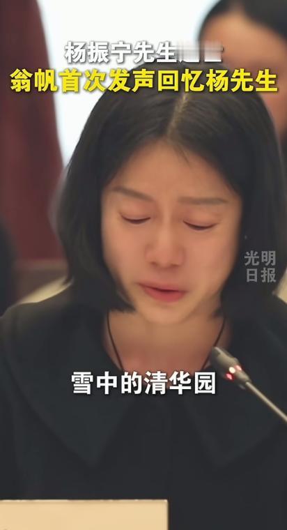 12月10日下午,翁帆在清华大学杨振宁先生追思会上作为家属发言,她说:“2003年,杨先生回到清华园定居,一年后我也来到清华,也就是21年前的12月,2004年12月,我记得那一天很冷,到北京的第二天早晨,我醒来的时候,天空飘着大雪,我从小在南方长大,那是我人生第一次看到雪,雪中的清华园特别美丽,2005年又一次下雪的时候,我和杨先生站在家门口,拍了张合照,这照片一直挂在我们家墙上……”   当天,翁帆身着黑衣,全程神情肃穆。   发言过程中,她多次陷入哽咽,眼泪不受控制地淌出,只能不时用纸巾擦拭,努力克制着情绪不让自己哭出声,甚至有好几次低头啜泣,那份未从悲伤中走出的状态,让在场者无不动容。   翁帆的发言没有宏大的叙事,全程聚焦于她与杨振宁先生在清华园共同生活的点滴日常,字里行间满是化不开的思念。   她讲述的诸多往事里,关于初雪的记忆尤为清晰,这也让我们得以窥见二人缘分开启时的模样。   2003年,杨振宁先生回到清华园定居,一年后的12月,翁帆也来到了这里,清华园就此成为二人相伴相守的重要载体。   翁帆是南方姑娘,在此之前从未见过雪,刚到北京的第二天早晨,她醒来时便看到天空飘着大雪。   翁帆动情讲述自己在清华定居的第二天,人生第一次看到雪,雪中的清华园特别美丽。   在我看来,这场初雪不仅让翁帆感受到了北方冬日的独特景致,更成为了二人情感的重要锚点,为这段跨越岁月的相伴埋下了温暖伏笔。   2005年冬天再次下雪时,她和杨振宁先生特意穿好外套走到家门口,在雪地里拍了一张合照,这张照片此后一直挂在他们家中的墙上,成为二人深情的具象纪念。   回望这段感情,从一开始就伴随着世俗的争议与嘲笑。   2004年12月,82岁的杨振宁与28岁的翁帆结为夫妻,54岁的年龄差让外界议论纷纷,但二人始终义无反顾,坚定地守护着这份感情。   二十多年的相伴时光里,他们将日子过成了细水长流的温暖。   杨振宁先生喜欢走路,二人常常在傍晚时分在校园里散步,闲暇时还会一起在校园内跑步,清华园的诸多角落,都留存着他们并肩同行的温馨回忆。   值得注意的是,共同生活的几十年间,翁帆始终称呼杨振宁为“杨先生”,从未使用过“丈夫”“老公”这类普通夫妻间的称谓。   在我看来,这一细节并非刻意疏远,反而藏着翁帆对杨振宁先生最深沉的爱慕与敬重,这份情感超越了普通的夫妻之情,更带着一种源于人格魅力与学术成就的深深折服。   翁帆曾坦言自己是杨振宁先生的“迷妹”,而当崇拜的人恰好也心生欢喜,这份双向奔赴的感情便有了最坚实的基础。   追思会上,翁帆再次提及家中悬挂的雪景合照,提及那些在校园里散步跑步的日常,这些细碎的片段串联起二人相守的岁月,也让思念有了具体的落点。   从昔日出双入对的相伴,到如今形只影单的回望,翁帆的悲伤清晰可见。   但她的讲述没有沉溺于痛苦,更多的是对过往温馨时光的回望,这份回望里,藏着对杨振宁先生无尽的思念,也藏着对这段感情的珍视。   斯人已逝,但那些留在清华园的回忆,那些藏在称谓里的爱慕,那些定格在照片里的瞬间,会让这份深情永远延续。   我们有理由相信,这份跨越岁月的情感不会因离别而消散,也期盼翁帆能在时光的抚慰下,早日走出悲痛,好好经营后续的生活,传承杨振宁先生的遗志。   今天的分享到这里就结束了,大家对此事有何看法,欢迎在评论区留言和讨论,感兴趣的可以点击头像加关注,我将每日更新优质内容,我们下期见。