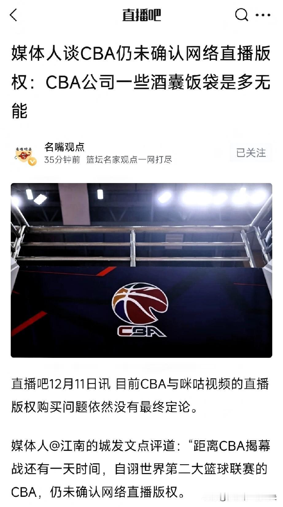 媒体人真敢说!评价:CBA公司一些酒囊饭袋是多无能!CBA倒计时一天,仍未确认网络直播版权;恕我直言不讳,CBA就好比办演唱会,说好主唱15首歌曲,结果歌迷买票后,发现现场歌手只唱12首,其他3首由不知名小明星客串,球迷当然不愿意!篮协指挥CBA将比赛压缩40分,剩下10分钟第五节锻炼年轻球员,咪咕作为投资者当然不买账,规则的改变导致CBA和咪咕合作破裂。