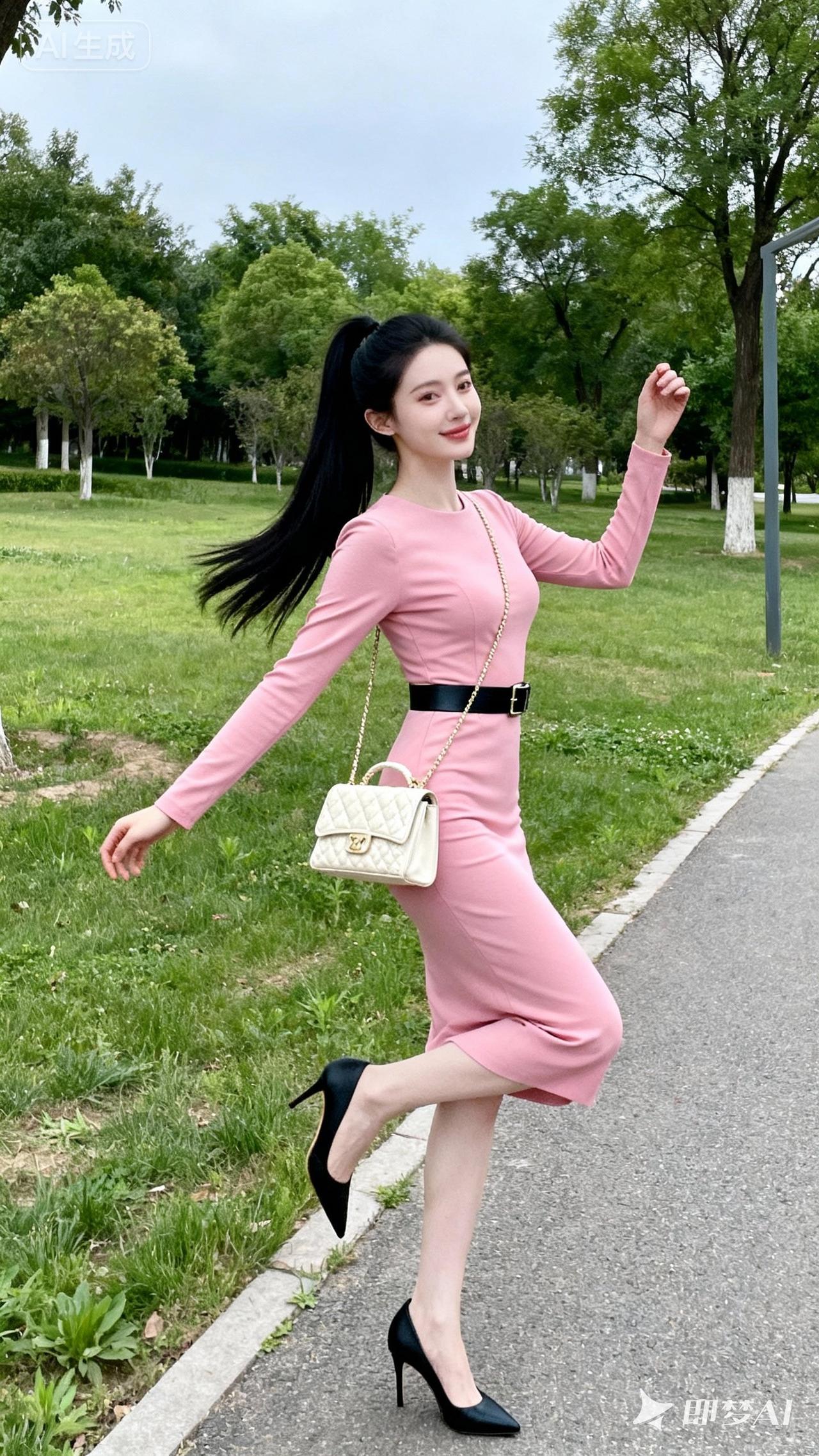 粉裙飘飘步轻盈,绿树掩映意自宁。