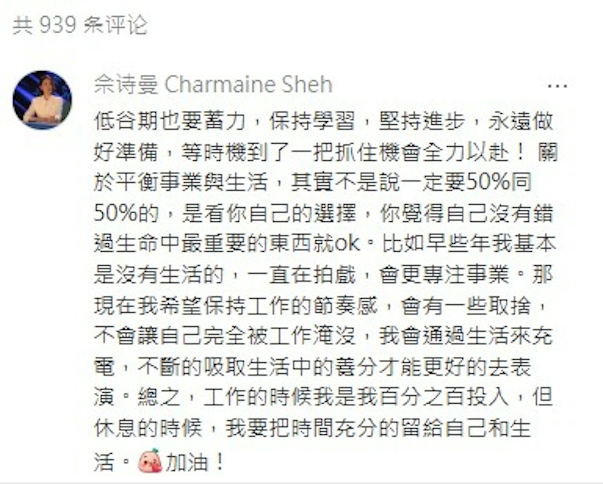 佘诗曼向来以宠粉闻名,不少粉丝曾偶遇她或是特地去等候,都能获得签名合照,可谓有求必应。没想到日前有粉丝在社交平台给佘诗曼写信,她居然亲自回复了,而且还是当天就回复,实在令人惊喜。粉丝的信开头写道 “致 Charmaine Sheh”,这位粉丝表示自己是佘诗曼多年的忠实粉丝:“从《金枝欲孽》里聪慧坚毅的尔淳,到《新闻女王》中果断飒爽的文慧心,你塑造的每一个角色都深深打动着我。” 这些角色也给了她很多鼓励。她还向佘诗曼提了几个问题:“真的很想听您分享一下,在面对职业中的瓶颈时,您是怎样调整心态、突破自我的?另外,作为公众人物,您如何平衡事业与生活,始终保持积极向上的状态?无论是否能收到您的回复,我都会一直支持您。”结果佘诗曼真的回复了这位粉丝,而且还是当天就回复了,实在是大大的惊喜。她留言写道:“低谷期也要蓄力,保持学习,坚持进步,永远做好准备,等时机到了就一把抓住机会全力以赴!关于平衡事业与生活,其实不一定非要追求 50% 对 50% 的完美比例,关键看你自己的选择,觉得没有错过生命中最重要的东西就好。比如早些年我基本是没有个人生活的,一直在拍戏,会更专注于事业。现在我希望保持工作的节奏感,会有一些取舍,不会让自己完全被工作淹没。我会通过生活给自己充电,不断汲取生活中的养分,才能更好地投入表演。总之,工作的时候我会百分之百投入,但休息的时候,我要把时间充分留给自己和生活。加油!” 跨年电影愿