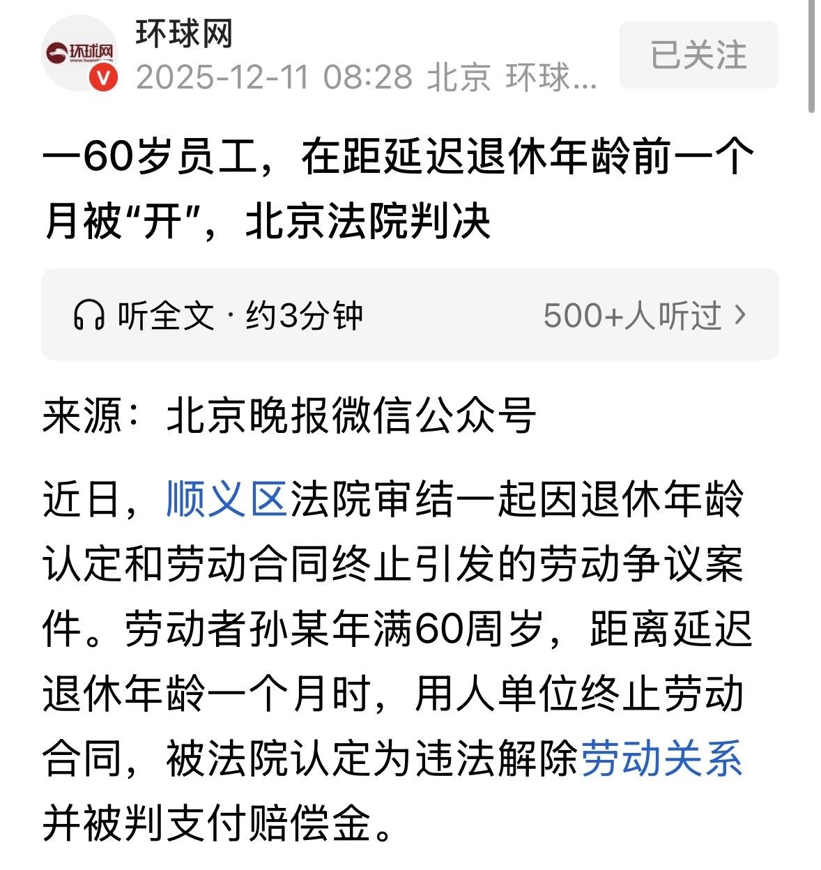 北京,男子58岁时入职一农场干保洁,在今年3月25号这天,已满60岁的他突然接到农场通知,说他以后不用再来了,工资按满勤发,男子一寻思,不对啊!按新出的法定延迟退休年龄,他应该在4月30号退休,农场提前一个月把他开了,属于违法解除,男子直接走仲裁,后裁决农场需付赔偿金,农场不服,把男子告上法院,结局解气! 2023年3月1号,58岁的孙某入职了某农场的保洁。 他虽然年龄挺大了,但干起活来一丝不苟,想着再干两年攒些养老金,等60岁到了就安心退休。 没想到啊,这2年后的退休日子,竟让公司给搅黄了。 2025年3月25号这天,孙某依旧在岗位上勤勤恳恳地干活,班组长突然过来喊他,说孙哥,农场说你不用再来上班了,工资按满勤发。 孙某一听,啥?自己明明天天按时上班,活儿一点没落下,咋说不用就不用了? 而且,根据去年刚出台的延迟退休政策明明写着,像他这样1965年3月30号出生的男职工,得等到2025年4月30号才到退休年龄,这农场提前1个月就撵人,不是明摆着违法吗? 孙某不知道农场这啥意思,他找到农场负责人理论,对方却掏出劳动合同,说咱签的合同就到2025年2月28号,后来多给你干到3月底,已经是照顾你了! 孙某这才想起,2024年续签的那份合同确实写着2024年3月1号到2025年2月28号,可再往前倒,2023年3月到2024年2月那年的干的活,都是口头约定的。 临近要退休了闹出这茬,孙某肯定是不甘心的,他直接走了劳动仲裁。 仲裁委一查,孙某从2023年3月到2025年3月这2年多,天天按时上班,农场也按月发钱,双方间的劳动关系是铁板钉钉的事实。 再加上新出的延迟退休政策,孙某确实得4月30号才退休,农场提前解约就是违法。 仲裁委后来就裁农场得赔钱,可农场不服气,扭头就把孙某告上了法院。 法庭上,农场咬死说合同2月底就到期了,多给老孙干1个月是“福利”,不是续签合同。 老孙这边拿出考勤表、工资条,证明自己从2023年3月到2025年3月25号天天上班,连2023年到2024年那年的活儿都算上,早就是连续两份合同了。 法官审理认为,连续签2次固定期限合同后,第二次到期得续签无固定期限合同,农场那‘延长1个月’的说法,抵不了劳动关系继续存在的事实。 让农场方没想到的是,那份渐进式延迟退休文件成了关键证据。 文件明确写着,像孙老汉这种1965年3月出生的男职工,退休时间得按“1965年+(3+出生月份)÷12”的公式算,精确到2025年4月30号。 农场非说老孙3月就该退,明显和政策对着干。 有人认为,这种单位就应该重罚!置法律于不顾,置公德于不顾,置劳务关系于不顾!太无法无天。 单位人事部不懂法规,违规操作,退休人不但可以到点退休还得到一次补偿,不耽误退休金,损失的是企业,按理企业应向违规者负责。 这个单位太缺德了,多付一个月工资而已,养老金又不是他们出,一点法律常识和人情冷暖都没有。 这个公司最该辞退的人员是提出该事件的人和批准的人,以及主管人事的人,在辞退理由上是不懂政策及法律法规,不宜从事人事工作。 那么,从法律角度,怎么看待农场方的行为? 《劳动合同法》第14条第3款规定:连续订立二次固定期限劳动合同,且劳动者没有本法第三十九条和第四十条第一项、第二项规定的情形,续订劳动合同的,劳动者提出或者同意续订、订立劳动合同的,除劳动者提出订立固定期限劳动合同外,应当订立无固定期限劳动合同。 孙某与农场自2023年3月1号至2025年3月25号期间存在连续劳动关系。双方虽然只签订2024年3月1号到2025年2月28号的书面合同,但农场认可孙某2023年3月至2024年2月的事实劳动关系,构成“连续订立二次固定期限劳动合同”的法定情形。 所以,农场在第二次合同期满后,仍负有与孙某续签无固定期限劳动合同的法定义务。 农场以“延长一个月至3月30日作为福利”为由终止劳动关系,实质是逃避续签义务。 孙某在合同到期后继续工作至3月25日,已通过实际行为表明续订意愿,农场单方终止劳动关系的行为违反法条强制性规定,构成违法解除。 依据《劳动合同法》第87条,用人单位违法解除劳动合同的,应按经济补偿标准的二倍支付赔偿金。 法官最后判决:农场提前终止劳动关系,既违反劳动合同法,又违背退休政策,属于违法解除,得赔老孙19480.85元。 这钱数不算多,可对孙某来说,这是对他2年多辛苦的认可。 对此,你怎么看? 关注@运良说法. 学法律知识不迷路